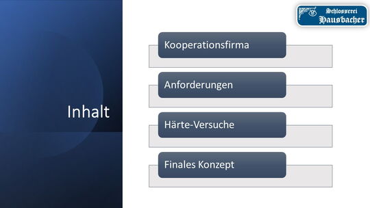 Gemeinsam mit der Schlosserei Hausbacher entwickeln die zwei Schüler ein Klappmesser aus Damaststahl, welches einen austauschbaren Griff mit zusätzlicher Federunterstützung aufweisen soll. Hierfür werden vier verschiedene Stähle mit dem Härteprüfverfahren untersucht und die Messergebnisse verglichen. Je nach Stahl, der die notwendigen Werkstoffeigenschaften aufweist, wird in späterer Folge für die Herstellung des Klappmessers verwendet. Das Augenmerk dieser Diplomarbeit liegt am außergewöhnlichen Design und der leichten Handhabung des Griffes. Weiters soll der Griff austauschbar sein wodurch spezielle Wünsche unserer Kunden gewährleistet werden können. Durch diese Funktion erlaubt es uns auch spezielle Werkstoffe wie Moabi Holz oder Geweih zu verwenden. Die Ergebnisse sind die erfolgreiche Entwicklung und Konstruktion eines Klappmessers aus Damaststahl.