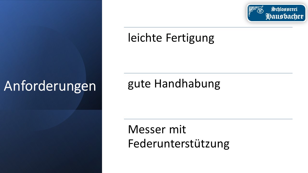 Es wurde ein neues Klappmesser, welche alle Vorgaben von Herrn Haubacher erfüllt und konstruiert. Dazu soll zuerst eine ausführliche Werstoffanalyse erfolgen, um die exakte Werkstoffzusammenzetzung ausfindig machen zu können.