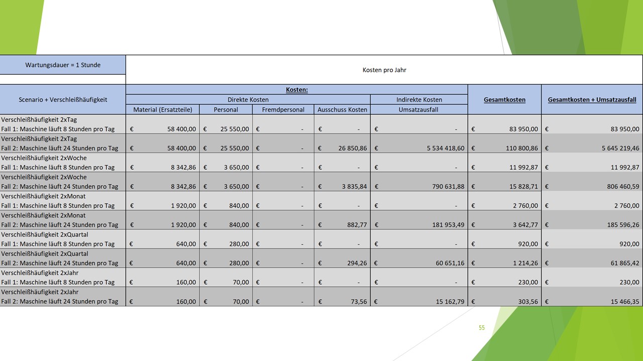 und Berechnung verschiedener Verschleißszenarien in tabellarischer Form.