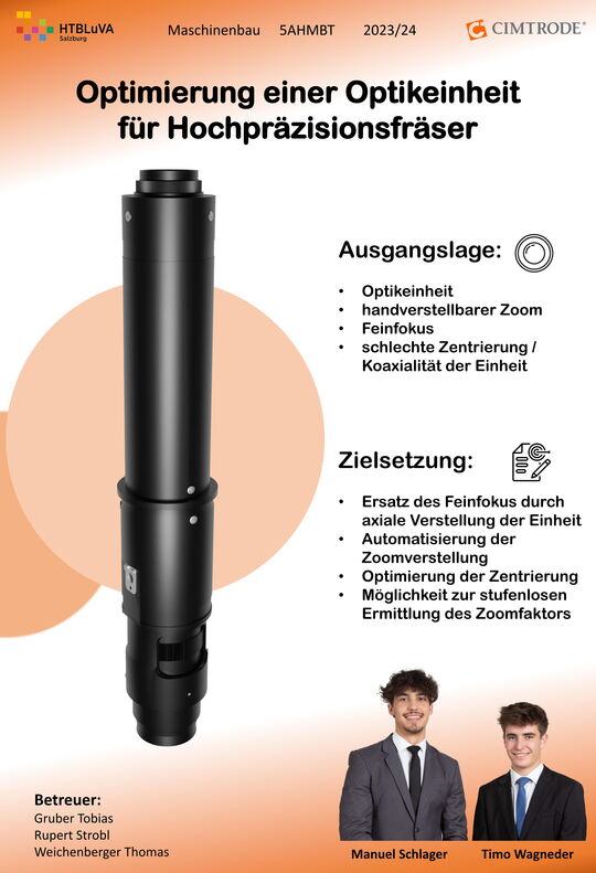 Die von der Firma Cimtrode hergestellten Graphitelektroden werden für hochpräzise Komponenten und Bauteile der Halbleiterindustrie, sowie der Spritzgussindustrie verwendet. Um die Elektroden herstellen zu können, werden genauso präzise Mikrofräser benötigt. Diese werden in einer, von der Firma Cimtrode entwickelten, Messmaschine auf Toleranzen und Konturen geprüft. Die in der Messmaschine verbaute Optikeinheit ist bisher ein amerikanisches Zukaufteil der Firma Navitar und weist einige Mängel auf. Um diese Mängel zu beheben und eine Automatisierung zu ermöglichen, war es nötig, die bestehende Optikeinheit neu zu entwickeln. Dazu wurden zwei neue, fertigungsreife Konzepte erstellt und konstruiert.