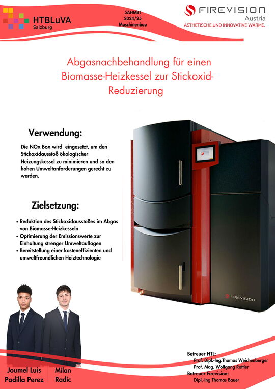 Die Firma Firevision sieht seine Aufgabe darin, sparsame und ökologische Heizungskessel zu entwickeln, die den höchsten Qualitätsanforderungen entsprechen. Um diese möglichst umweltfreundlich zu gestalten, soll eine Anlage entwickelt werden, die den Stickoxidverbrauch senken soll.