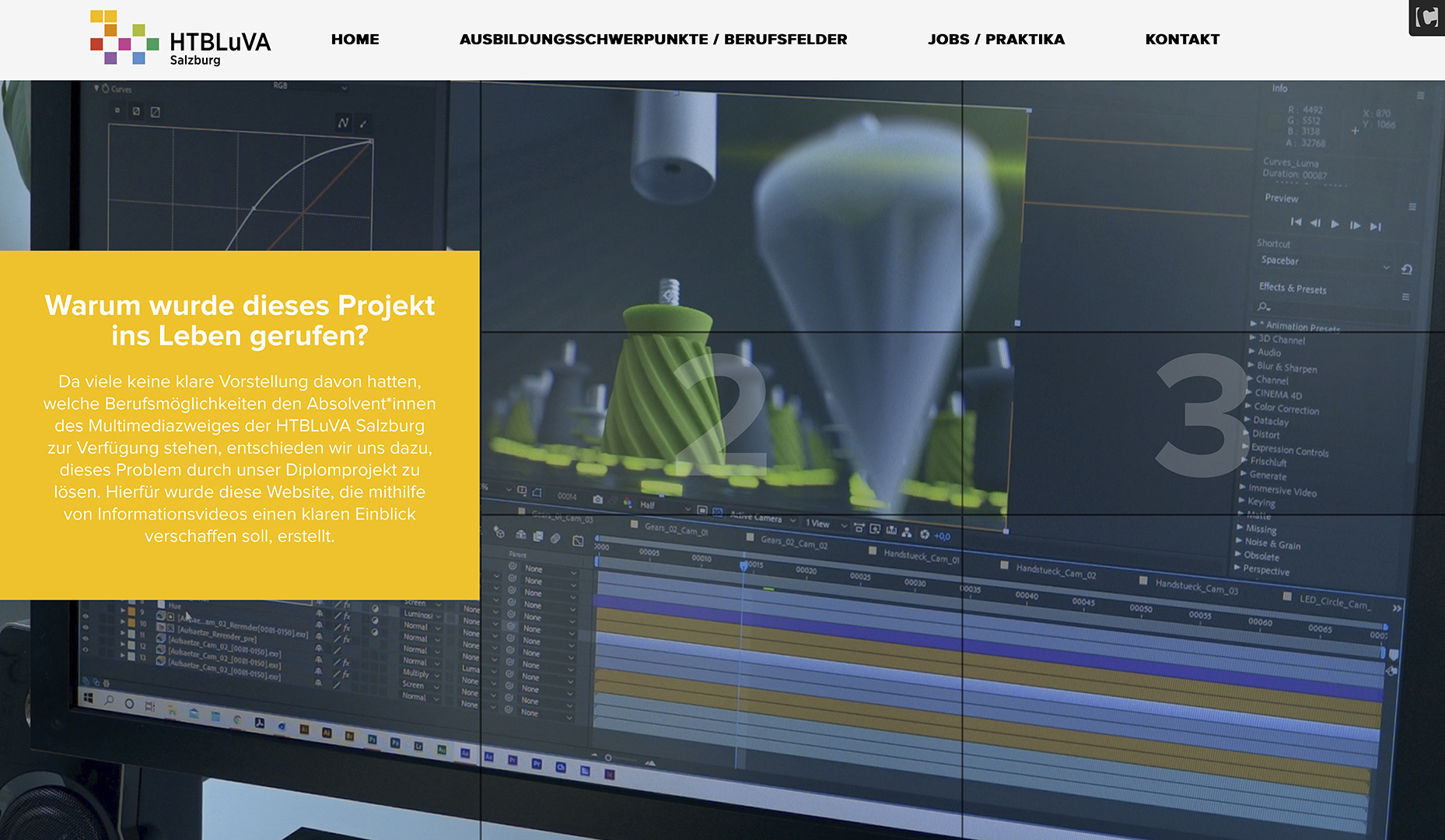 Hierfür wurden innerhalb des Diplomprojektes Interviews mit unterschiedlichsten Personen, die bereits in den Berufsfeldern tätig sind, gedreht. Diese Interviewsequenzen sind auf einer eigens angelegten Website zu finden. Ziel unseres Projektes ist es, dass sowohl aktuelle Schüler*innen, zukünftige Schüler*innen als auch deren Eltern besser darüber informiert werden, welche Berufsmöglichkeiten die Ausbildung am Multimediazweig der HTBLuVA bietet.
