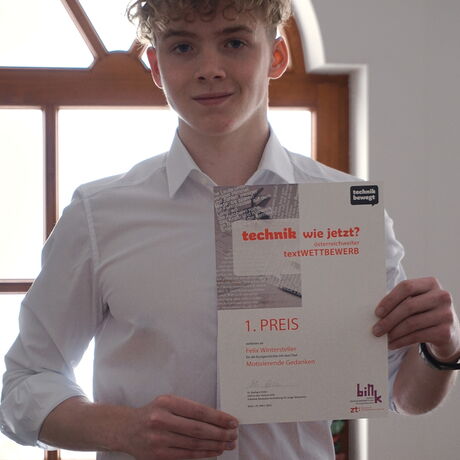 Nach Lisa Grubmayr und Stefanie Bauregger, die den österreichweit ausgelobten Textwettbewerb „technik! wie jetzt!“ 2019 und 2020 gewannen, wurde Felix Wintersteller für seinen Text „Motivierende Gedanken“ mit dem ersten Preis ausgezeichnet.