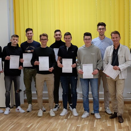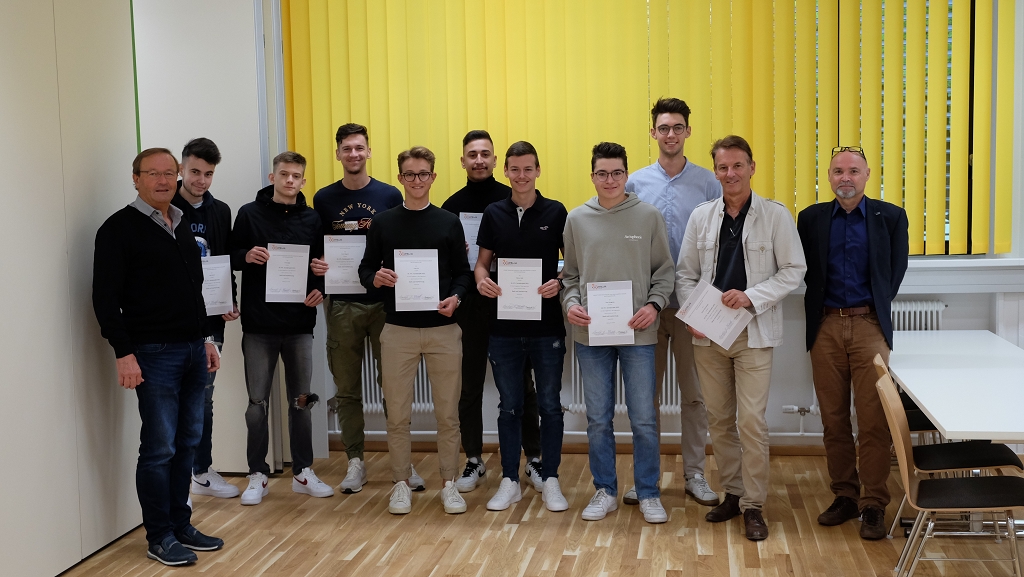 Bild 17: Direktor Dr. Franz Landertshamer, Abteilungsvorstand Bmstr. Dipl.-Ing.(FH) Herbert Buchner und Arch. Dipl.-Ing. Hans Peter Enzesberger danken den Schülern, die 4 bis 6 Tage gearbeitet haben und überreichen ihnen die Urkunde „Dank und Anerkennung“. Nicht auf dem Bild: Adrian Übertsberger