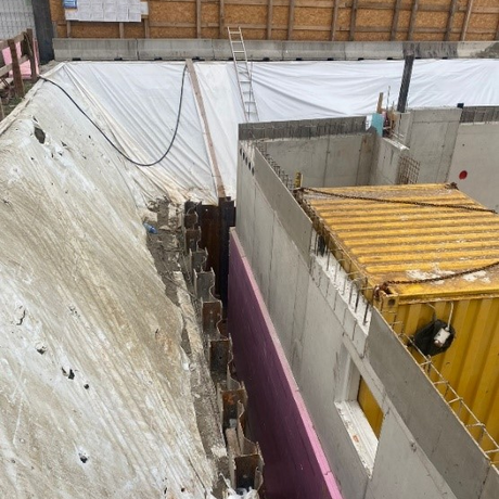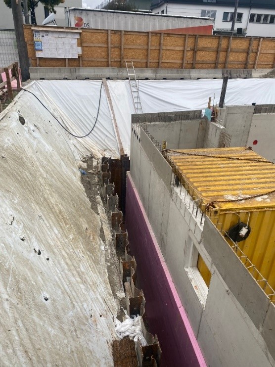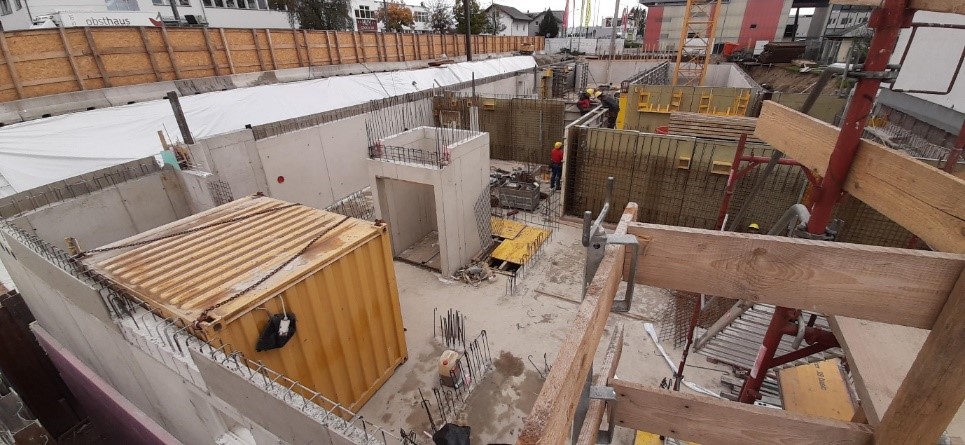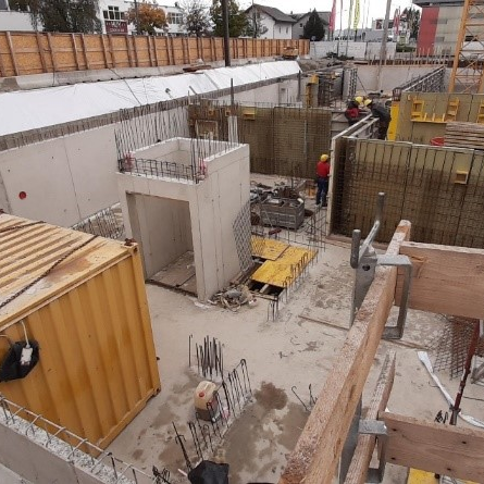 Gesetzt wird bei dem besichtigten Bau auf eine Stahlbetonbauweise in Ortbetonfertigung. Für die SchülerInnen interessante Besonderheiten im Bauverlauf der Großbaustelle sind vor allem der hier verwendete Baugrubenverbau mittels Stahlträgern, zwischen welche Spundwandbohlen gerammt wurden. Besonders lehrreich für die jungen TechnikerInnen der Klasse waren außerdem die herausfordernde Kranpositionierung am Bauplatz und die verwendeten Schalungssysteme mit Einsicht in die Bewehrungs- und Schalungspläne. Zusätzlich wurde den SchülernInnen ein hocheffizientes Aufmaßsystem in Form einer speziellen Totalstation, auf welcher die Baupläne am Bildschirm sichtbar eingespielt werden und Messpunkte ohne konventionelles händisches Messen genau eingemessen werden können, erläutert.