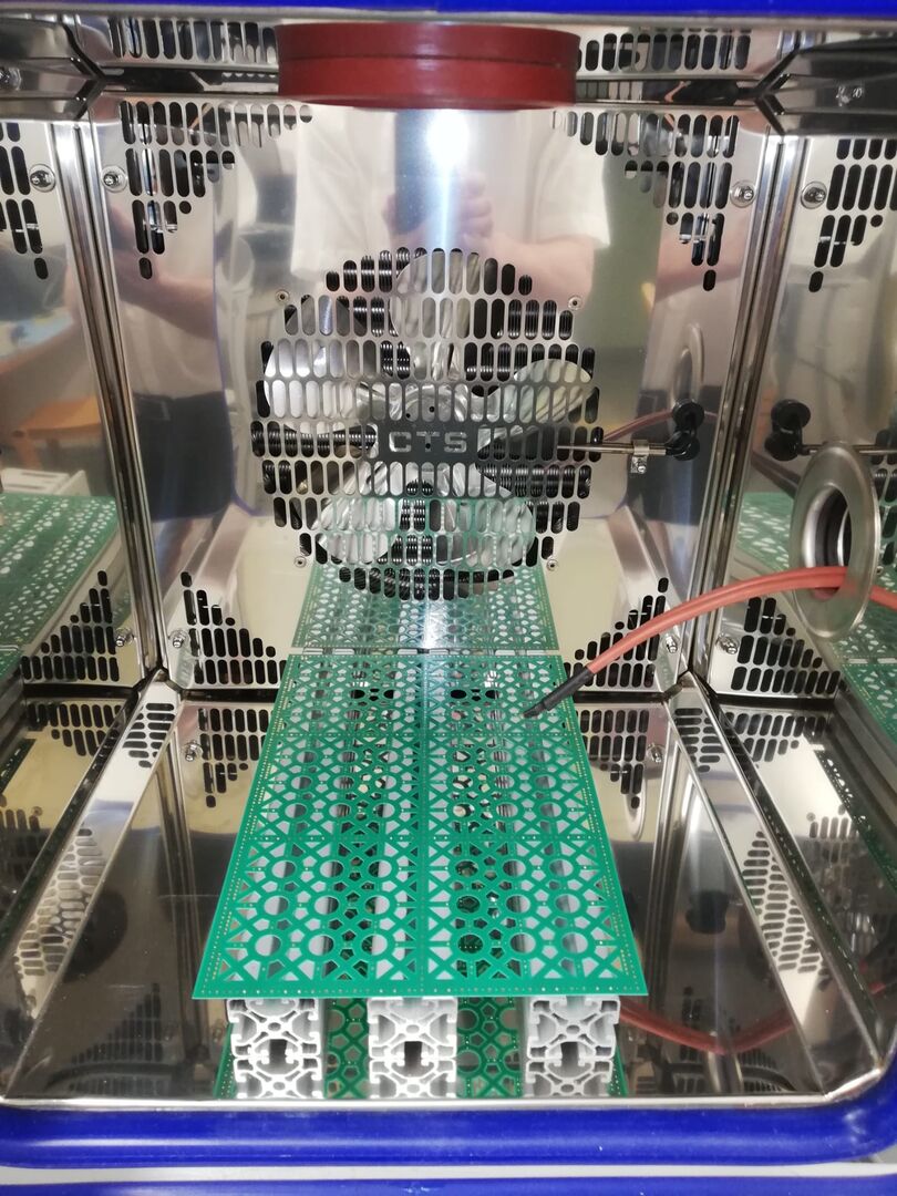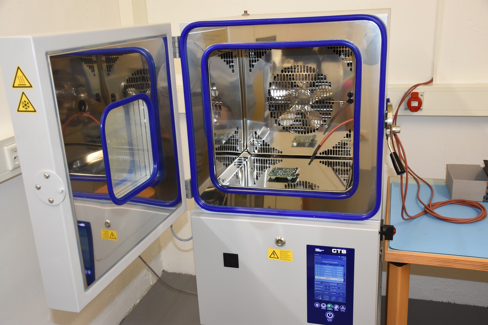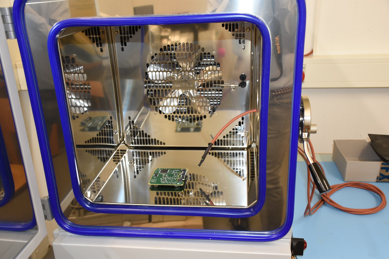Im Prüfstand wurden die Platinen stundenlang extremen Temperaturen von ca. +90 °C bis -65 °C ausgesetzt. Danach kamen sie in die Vakuumkammer bei einem Druck von ca. 100 Pa. Diese Tests dienen der frühzeitigen Erkennung von Materialproblemen die im Betrieb in der Umlaufbahn auftreten könnten.