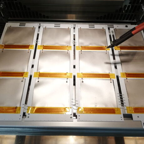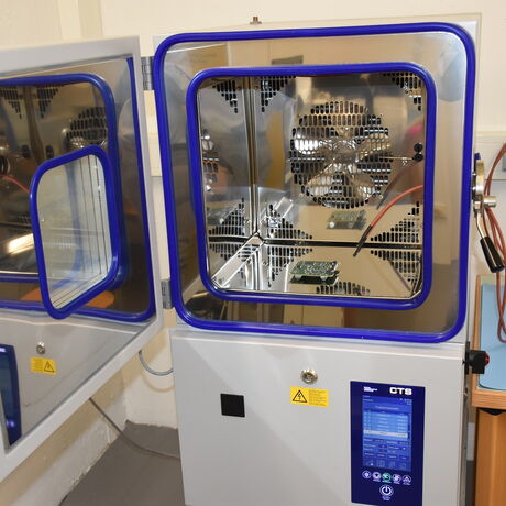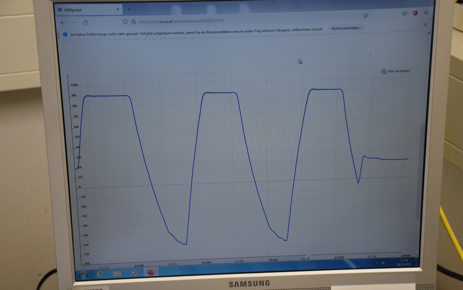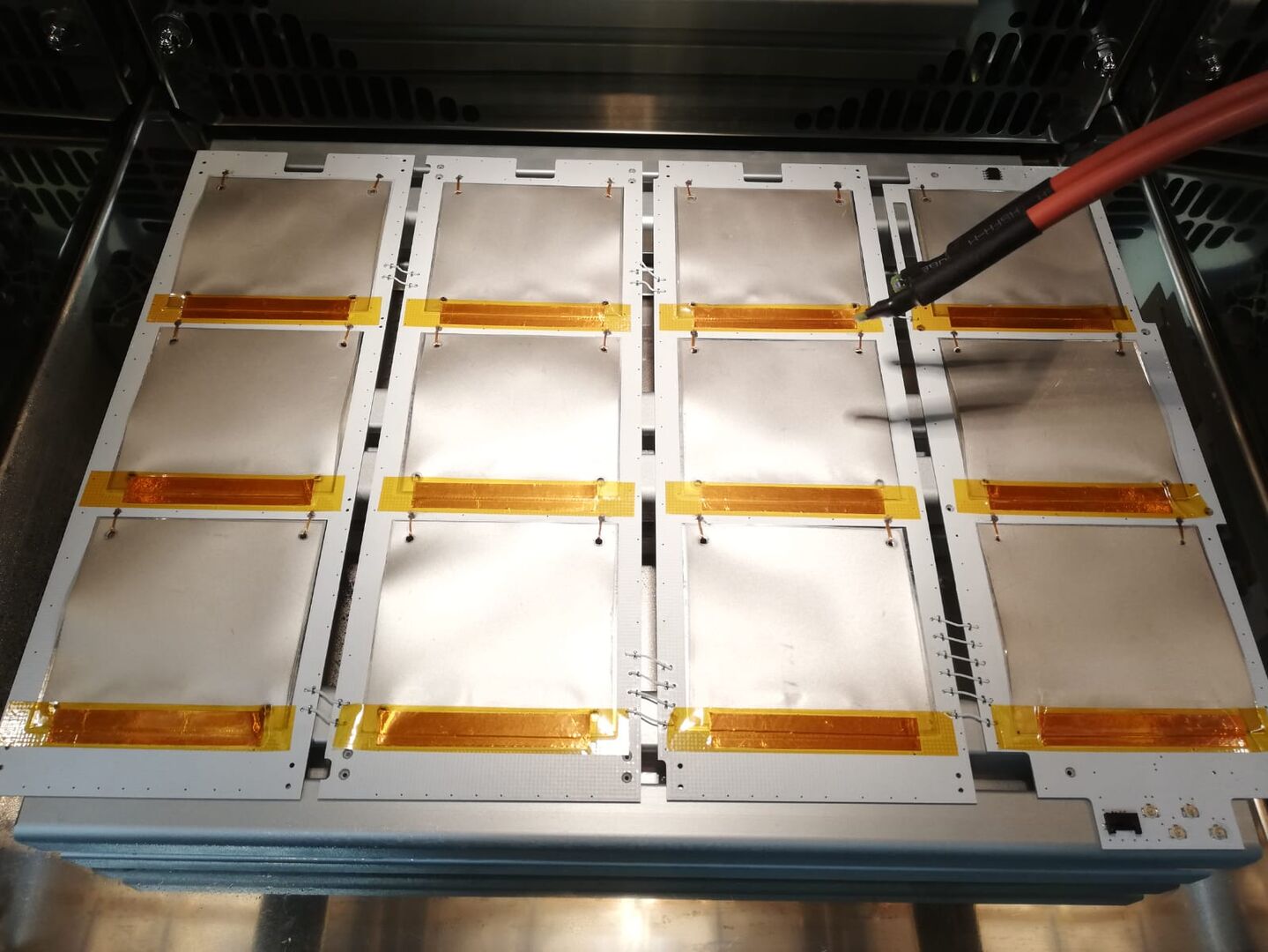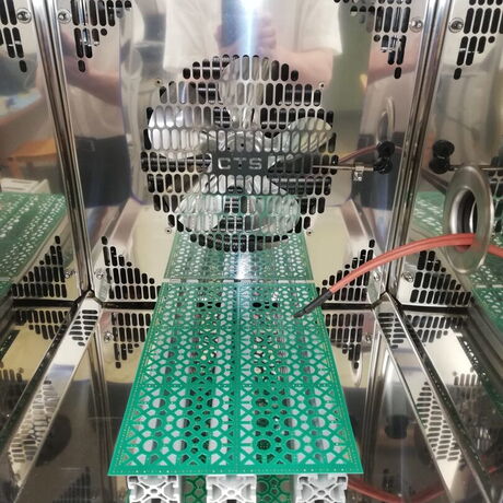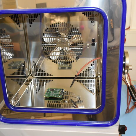 Im Prüfstand wurden die Platinen stundenlang extremen Temperaturen von ca. +90 °C bis -65 °C ausgesetzt. Danach kamen sie in die Vakuumkammer bei einem Druck von ca. 100 Pa. Diese Tests dienen der frühzeitigen Erkennung von Materialproblemen die im Betrieb in der Umlaufbahn auftreten könnten.