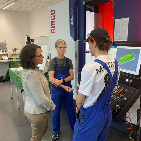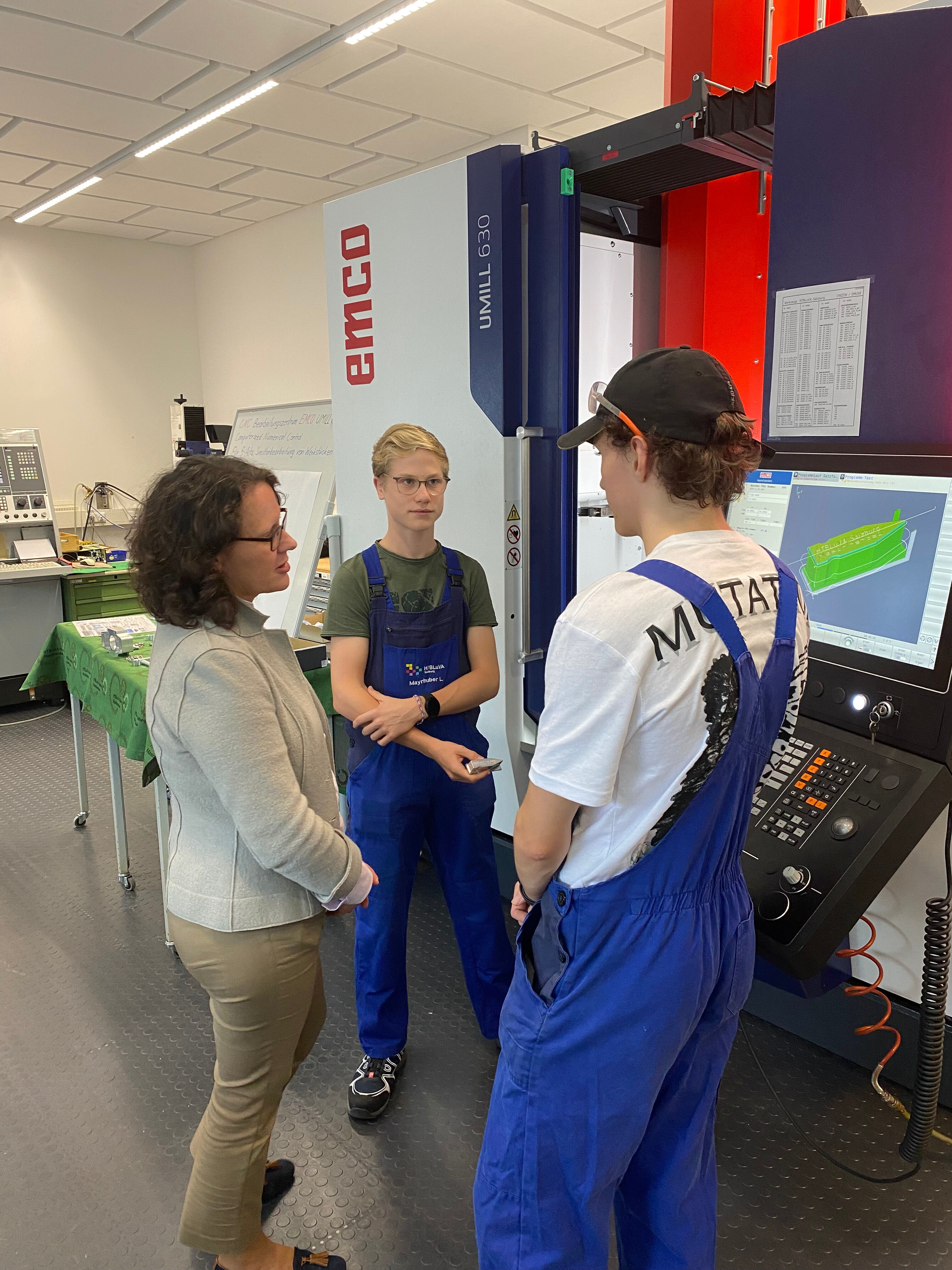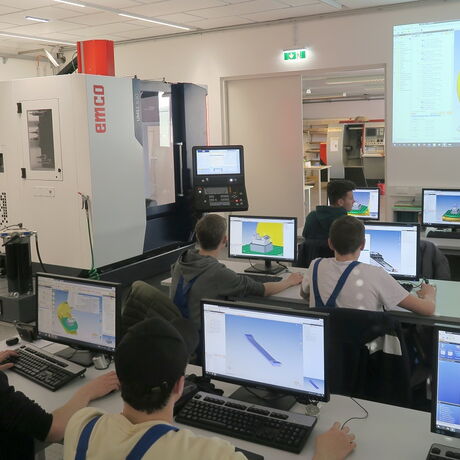 Damit diese Maschine für den Unterricht bestmöglich eingesetzt werden kann, wurde ein neuer Arbeitsraum eingerichtet. Die Anordnung der neun Arbeitsplätze für Schüler:innen in unmittelbarer Nähe der Maschine ermöglicht einen praxisnahen Unterricht, der dem neusten Stand der Technik entspricht.