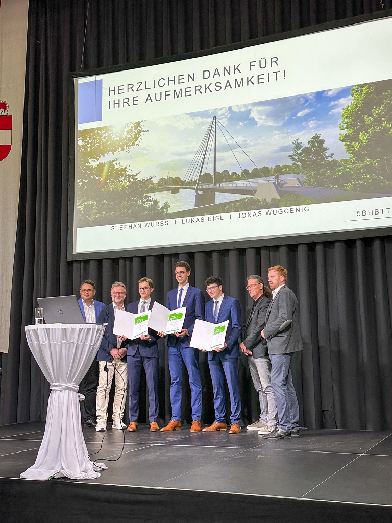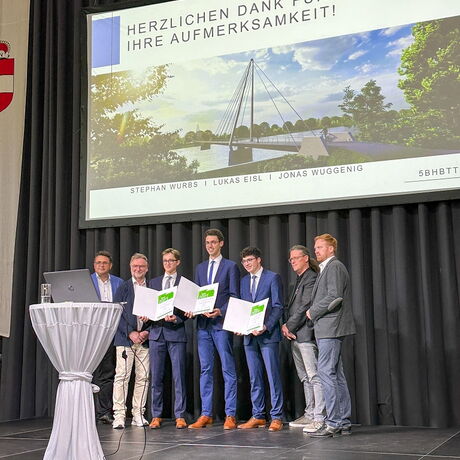 In der Kategorie Ingenieurbau wurde die Diplomarbeit „Länderübergreifende Geh- und Radwegbrücke“ von Stephan Wurbs, Lukas Eisl und Jonas Wuggenig zum Preisträger gekürt.