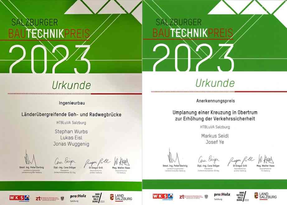Beim Bautechnikpreis 2023 setzten sich zwei Diplomarbeitsteams der der Abteilung Bautechnik - Tiefbau an der HTL Salzburg erfolgreich gegen die Konkurrenz anderer Bautechnik-HTLs durch: