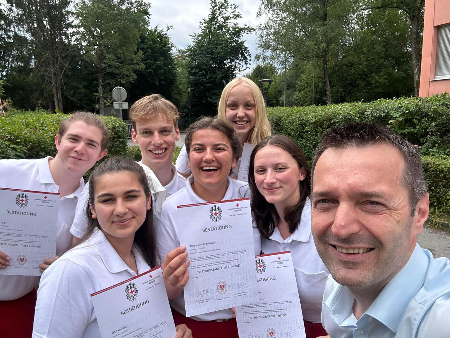 Zehn Schülerinnen und Schüler der 4AHBG 2022/23 haben im vergangenen Schuljahr die Ausbildung zum Rettungssanitäter im Rahmen des Unterrichts an der HTBLuVA begonnen. Am 27.06.2023 haben diese die Ausbildung erfolgreich mit Auszeichnung abgeschlossen und haben nun die Berechtigung zur Tätigkeitsausübung als Rettungssanitäter/-in erhalten.
