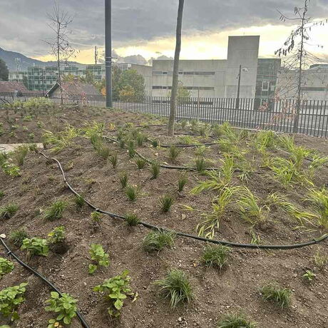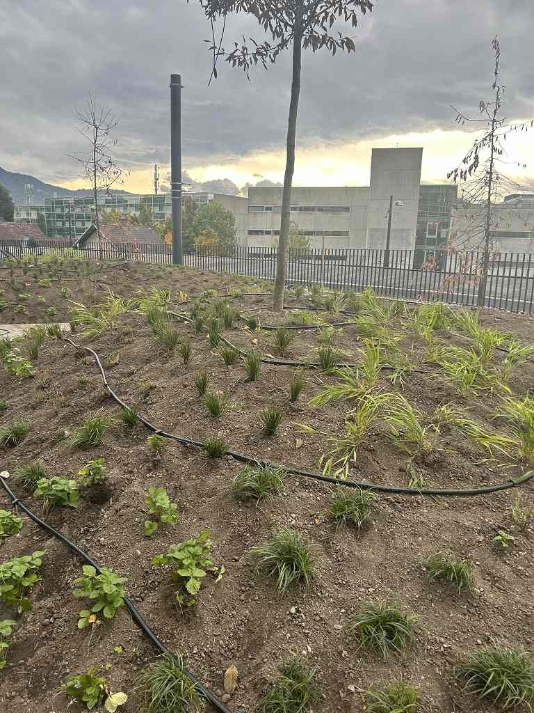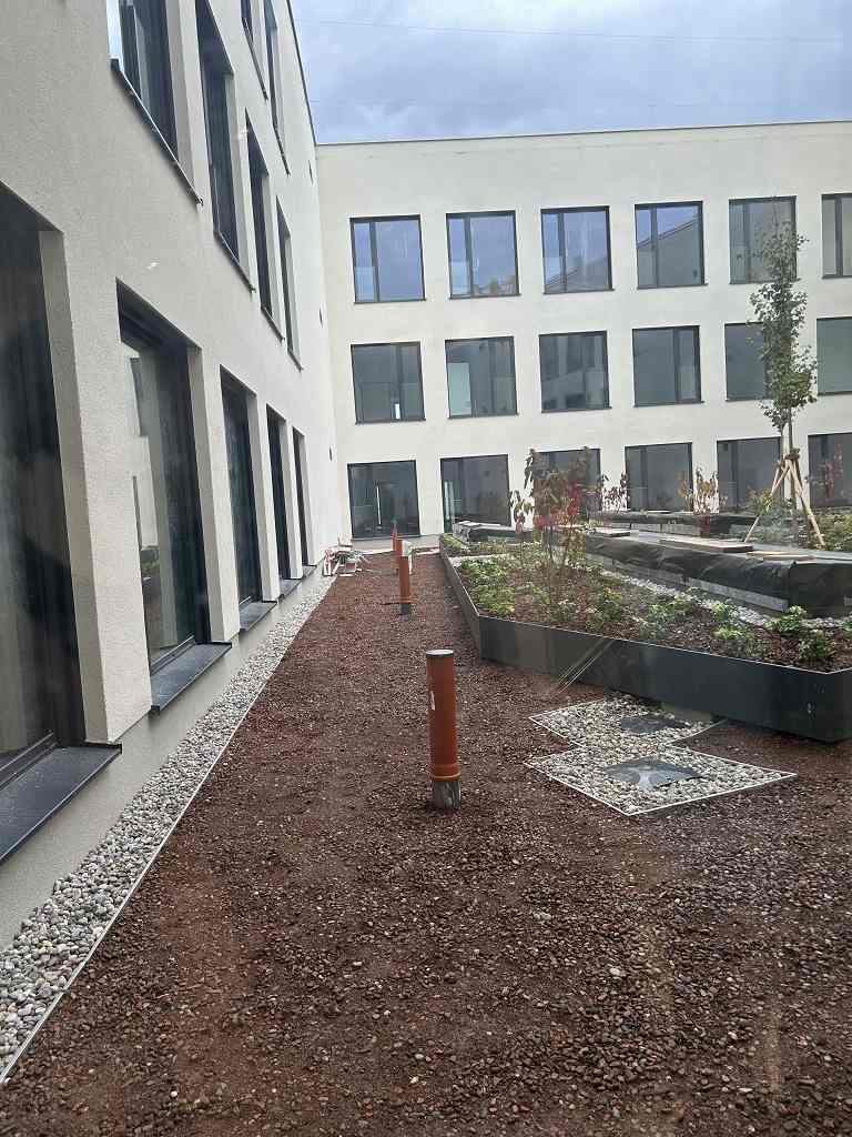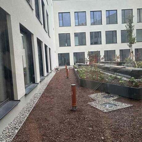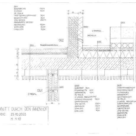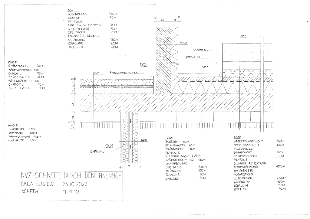 Im Rahmen des Unterrichts in Baukonstruktionslehre wurden in den vergangenen Monaten die Aufbauten von Decken und Flachdächern erlernt. Vor Ort konnte das in der Theorie erworbene Wissen auf der Baustelle erkundet werden. Schwerpunkt der Verknüpfung von Erlerntem und realer Detailausführung bildete das Studium des begrünten Innenhofs, der in Folge als Detailplan nachgezeichnet und somit besser, intensiver verstanden wurde.