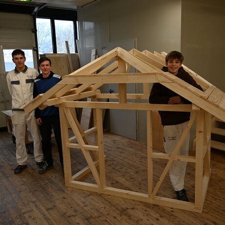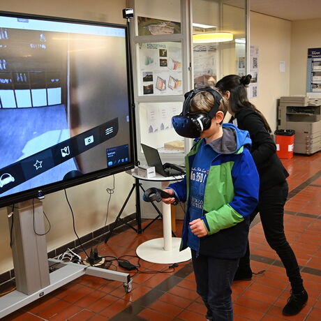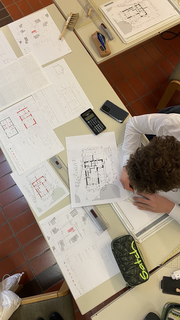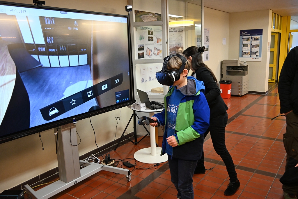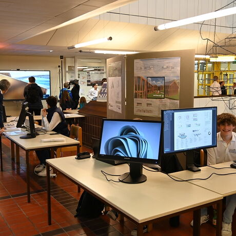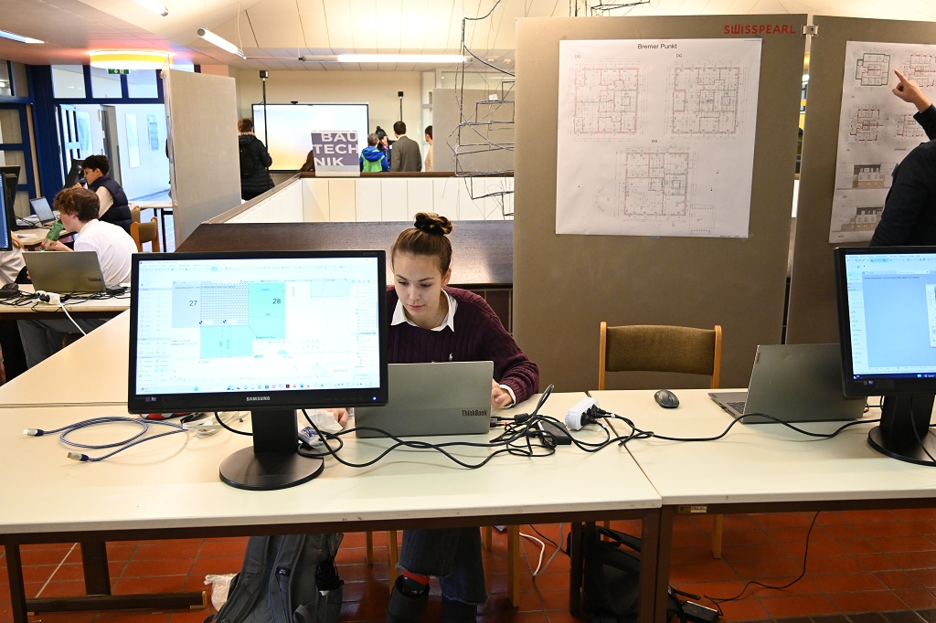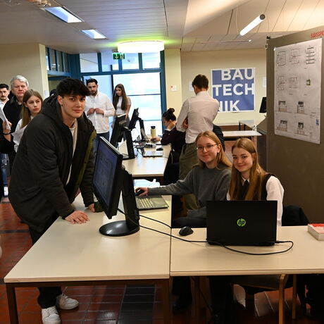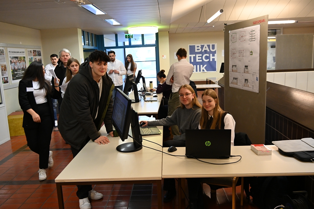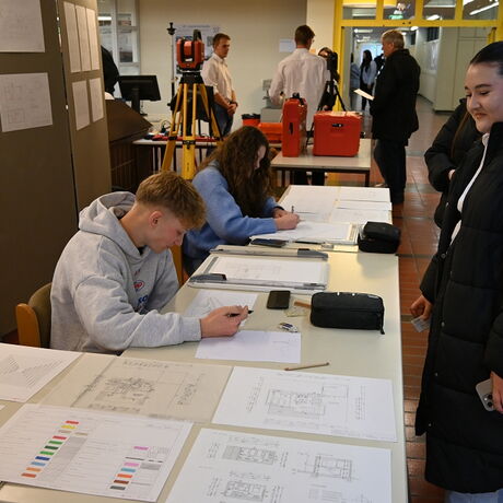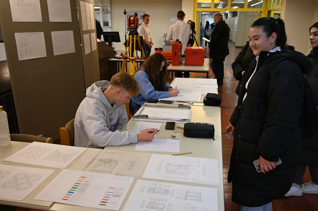 Dabei erhielten sie einen Überblick über das Ausbildungsangebot unserer Abteilung. Sie konnten einerseits den Unterricht in Klassenräumen live erleben und andererseits den praktischen Unterricht im Bauhof und im Baulabor besuchen. An den aufgebauten Ständen im Lichthof zeigten unsere Schüler:innen die Schwerpunkte der Ausbildung, wie technisches Zeichnen und CAD-Zeichnen, und auch der Einsatz der VR-Brille konnte ausgetestet werden.