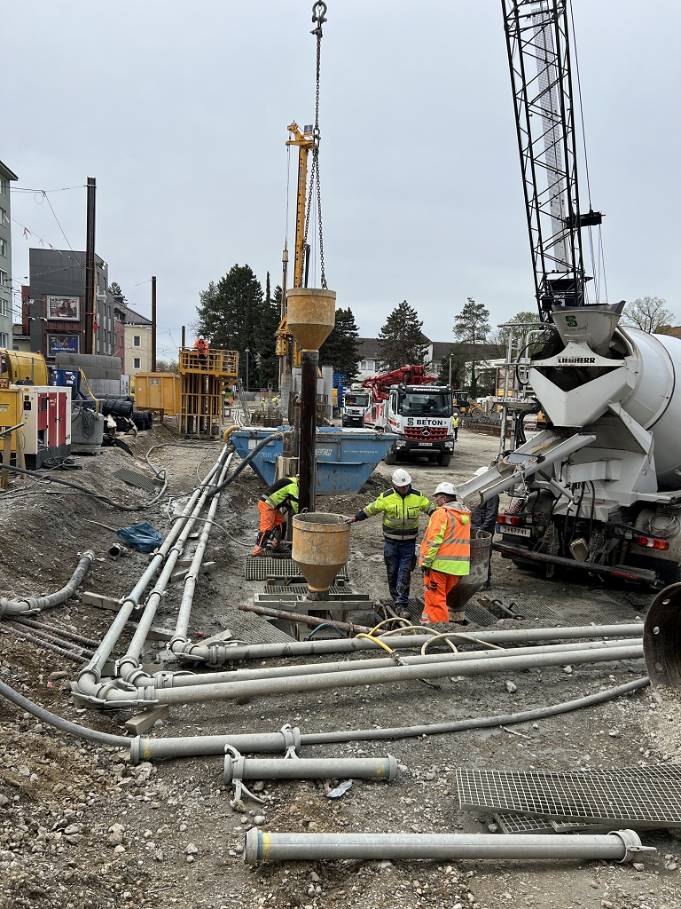 Nach Abschluss der Abbrucharbeiten werden in der momentanen Bauphase rundumlaufende Schlitzwände und zahlreiche Bohrpfähle am Baugrund errichtet.