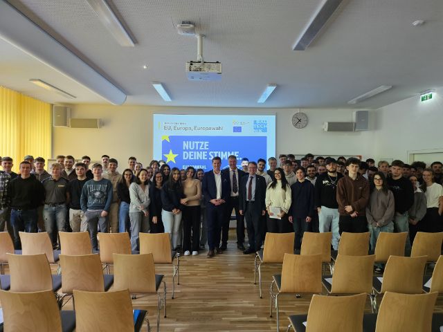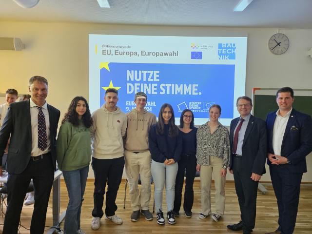 Im Rahmen des GGP-Unterrichts der drei vierten Jahrgänge der Bautechnik-Abteilung besuchten der EU-Parlamentarier Hannes Heide und ÖAAB-Landesgeschäftsführer Jurica Mustac die SchülerInnen, um unter der Moderation von Prof. Markus Kainzner Fragen zu den Themen Europäische Union, Europa und der anstehenden Europawahl am 9. Juni zu diskutieren.