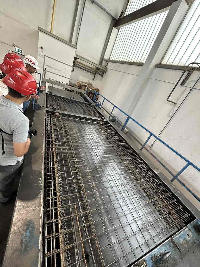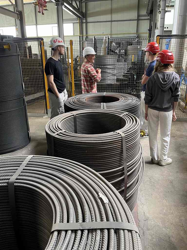 Um 9 Uhr starteten wir unseren Tag von der Jugendherberge Richtung Gerasdorf zum Fertigteilwerk Mischek. Dort angekommen, bekamen wir eine Einführung in die Geschichte und erhielten generelle Information über die Firma sowie deren Produkte. Anschließend wurden wir für eine Führung durch das Werk in drei Gruppen aufgeteilt. Es gibt 3 Produktionshallen für die Erstellung von Fertigteilwänden und -decken sowie anderer Bauteile. Die Arbeitsgänge Schalen, Bewehren und Betonieren erfolgen dabei weitgehend automatisiert. Für Sonderanfertigungen wie z.B. Liftschächte ist jedoch nach wie vor ein großer Anteil manueller Arbeit notwendig.