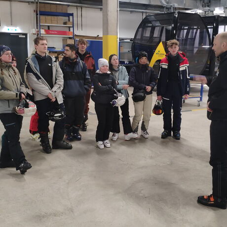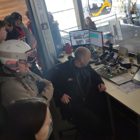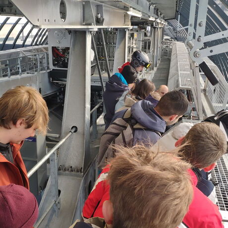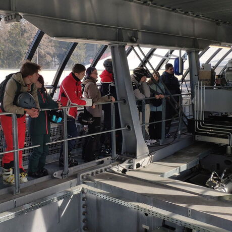 Doch damit nicht genug – für die Skifahrer gab es ein ganz besonderes Highlight: eine exklusive Führung durch die Gondel-Talstation. Dort bekamen sie faszinierende Einblicke in die Technik und Wartung der Bergbahnen. Wie bleibt die Gondel eigentlich in der Spur? Was passiert, wenn jemand seine Skier darin vergisst? All das wurde mit viel Enthusiasmus erklärt. Zum krönenden Abschluss ging es über Stiegen auf eine Plattform, von der aus die Klasse einen spektakulären Blick auf die fahrenden Gondeln und die gesamte dahinterstehende Technik werfen konnte.