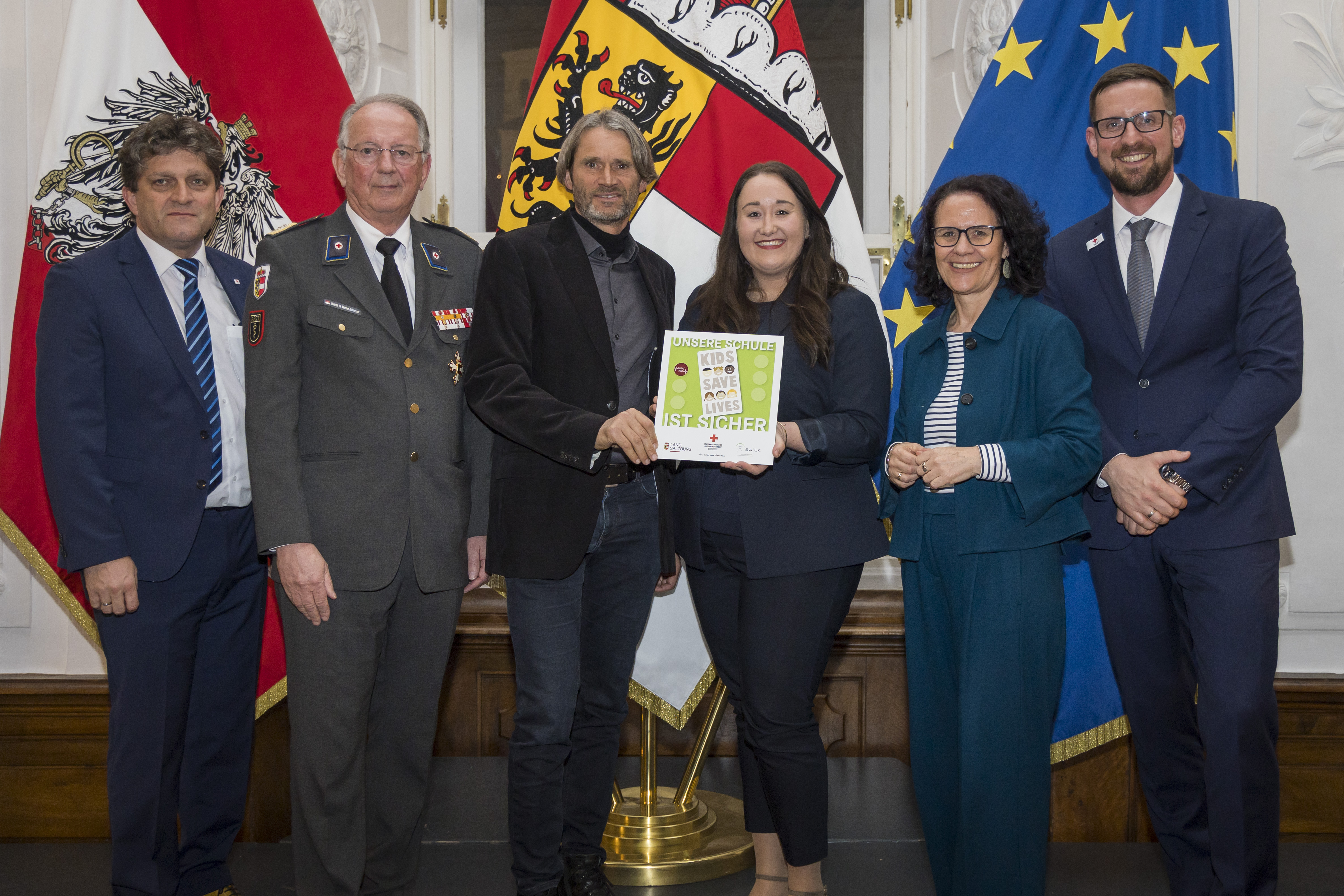 Im Bild: LR Daniela Gutschi, RK-Präsident Dr. Werner Aufmesser, Projektinitiator Dr. Bernhard Schnöll, Anton Lettner (Landesleitung Jugend Rotkreuz) und Katharina Zeilinger und Rupert Krallinger (HTL Salzburg).