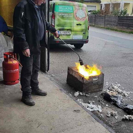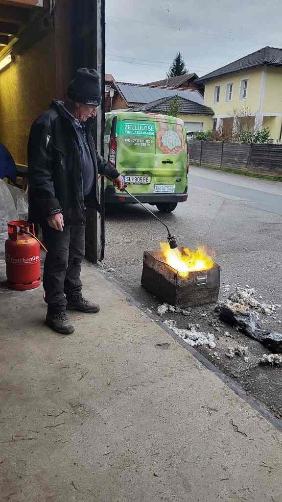 Die Firma Isocell ist marktführend im Bereich der Zellulose-Einblasdämmung und verwirklichte auf ihrem Firmengelände ein umfangreiches Angebot an Schaulagern, Ausstellungsflächen und Demonstrationsobjekten, die sie ausführenden Firmen zu Schulungszwecken zur Verfügung stellt. Das Einblasen der Dämmung in Steildachkonstruktionen wurde von erfahrenen Mitarbeitern in einem Musterhaus vorgezeigt. Ebenso wurde das Brandverhalten der Zellulose praktischerweise mit dem Flämmer als Versuch in Echtzeit vorgeführt.