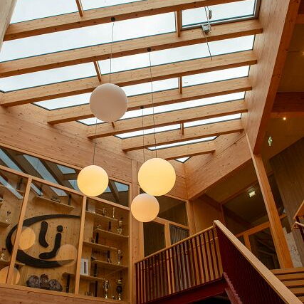 Bei der Besichtigung der beiden Neubauten in massiver Holzbauweise konnten die Schüler:innen der 4C nicht nur städtebaulich überzeugende Entwürfe erleben, sondern Holzbaudetails aus der Nähe erkunden. Architekt DI Georg Huber, Architekt der Kinderstadt Neumarkt und Mitglied des Gestaltungsbeirats, erläuterte das Konzept des Kindergartens, der wie eine kleine Stadt angelegt ist und fünf Gruppen und zwei Kleinkindergruppen beinhaltet. Anhand von Konstruktionsplänen erklärte er den Schüler:innen Aufbauten und Details des Holzbaus, die sie sogleich mit der gebauten Realität vergleichen konnten.