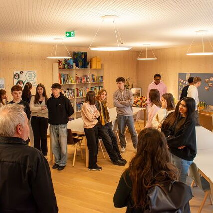 Die Führung durch die beiden öffentlichen Bauten, die ein neues Zentrum mit großzügigem Vorplatz bilden, brachte den Schüler:innen nicht nur Ideen für ihre Abschlussprojekte, sondern zeigte anschaulich die Qualität des urbanen Holzbaus.