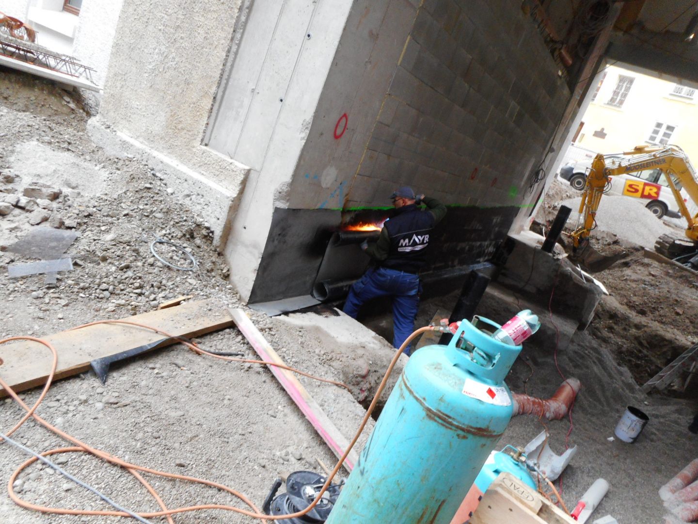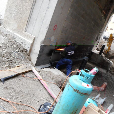 Im Innenhof konnte der Bodenaufbau mit Filterbeton auf Drainagematten besichtigt werden. Im Bereich der Durchfahrt war die Aufbringung eines Voranstriches und einer vertikalen Abdichtung zu beobachten.