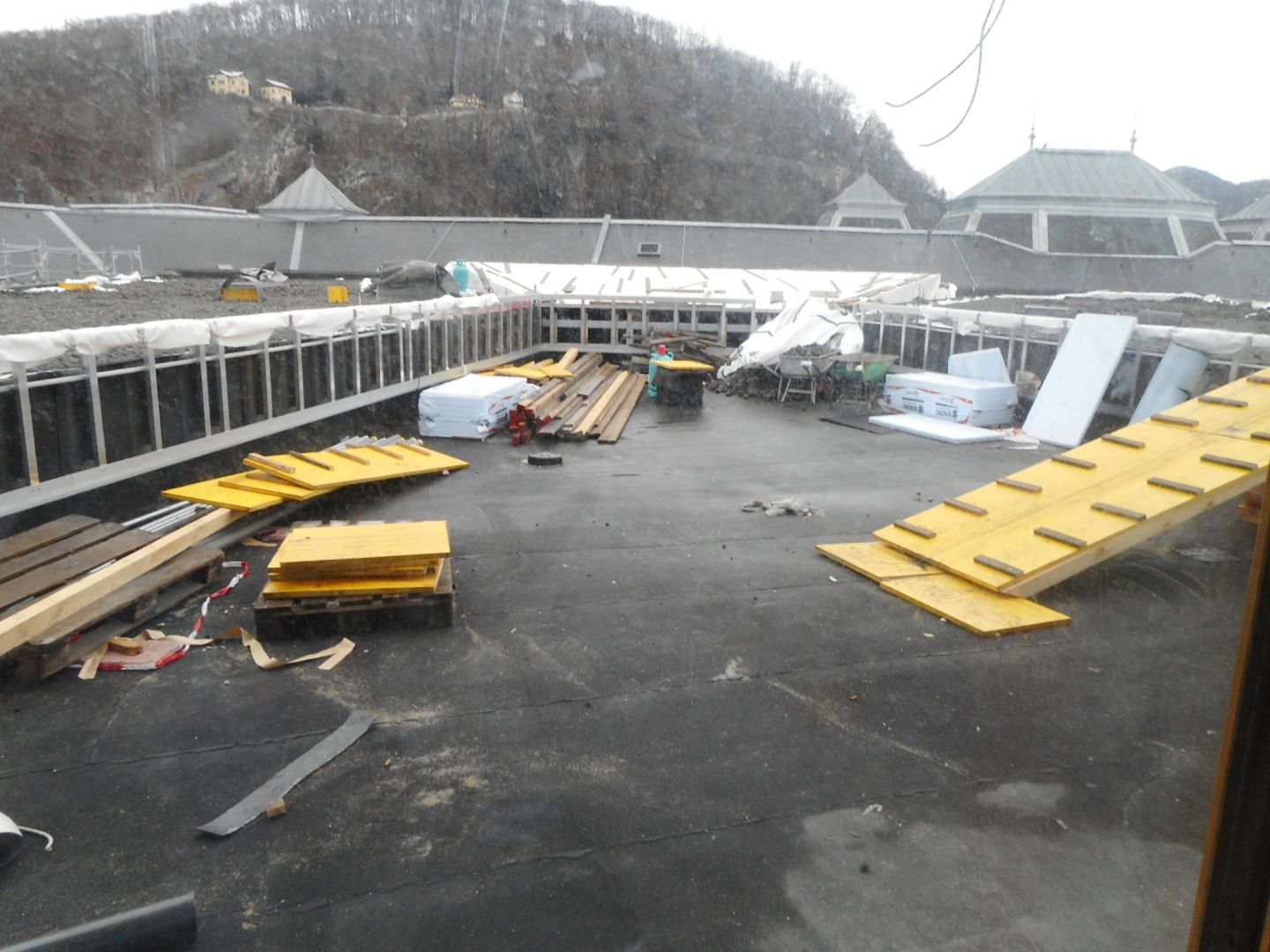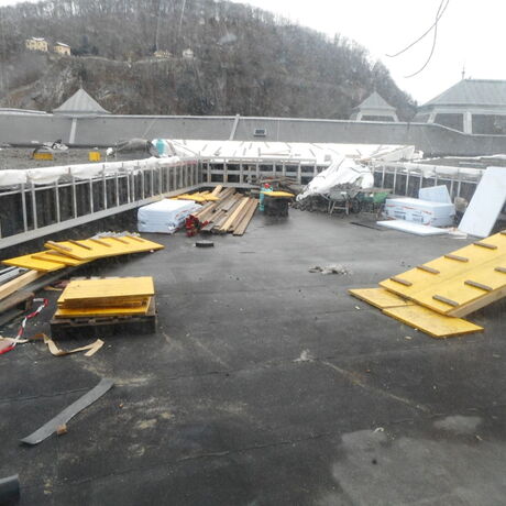 Die Baustellenbesichtigung begann im Schwurgerichtssaal und führte über sämtliche Geschoße, zum Dach-Cafe, Keller und Innenhof. Im Dachgeschoß konnte die Flachdachabdichtung mit entspechenden Hochzügen und Entwässerungsgullys gesehen werden. Das Flachdach wurde mit Feuchtesensoren ausgestattet, die Undichtheiten rasch nachweisen und lokalisieren können.