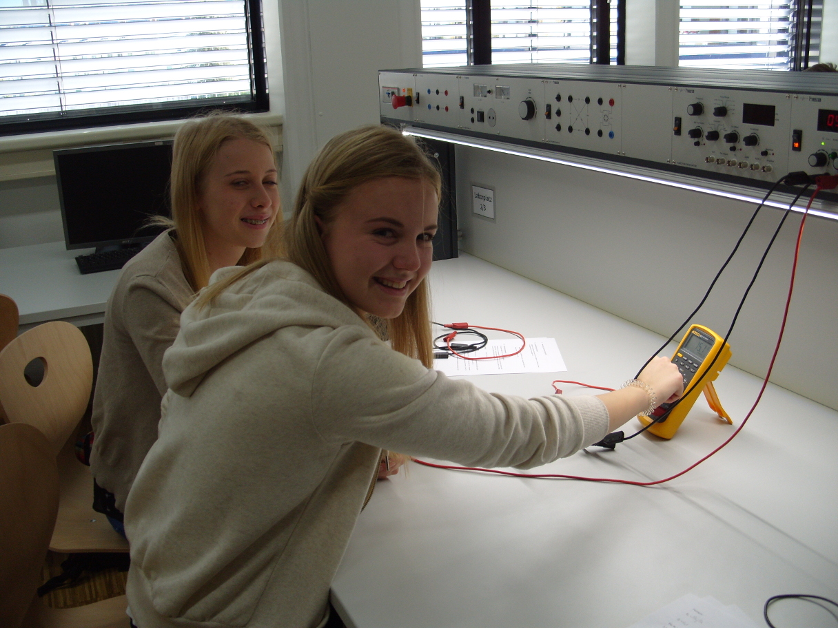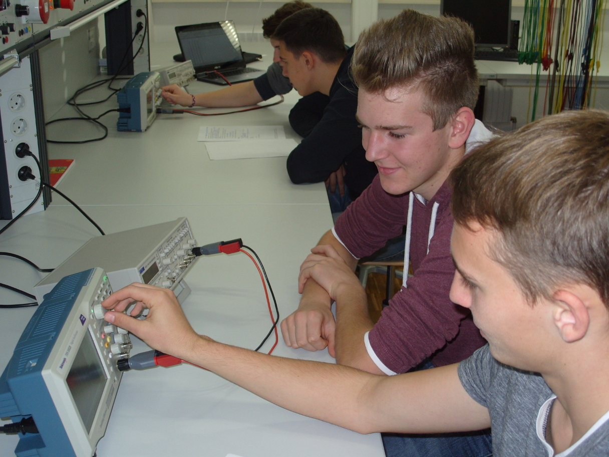 In den Übungen in diesem Raum bearbeiten die Schülerinnen und Schüler der dritten Klassen in Zweierteams in Messungen an Schaltungsaufbauten in verschiedenen Anforderungsstufen die wesentlichen Inhalte des elektrotechnischen Grundlagenstoffes der ersten Klassen.