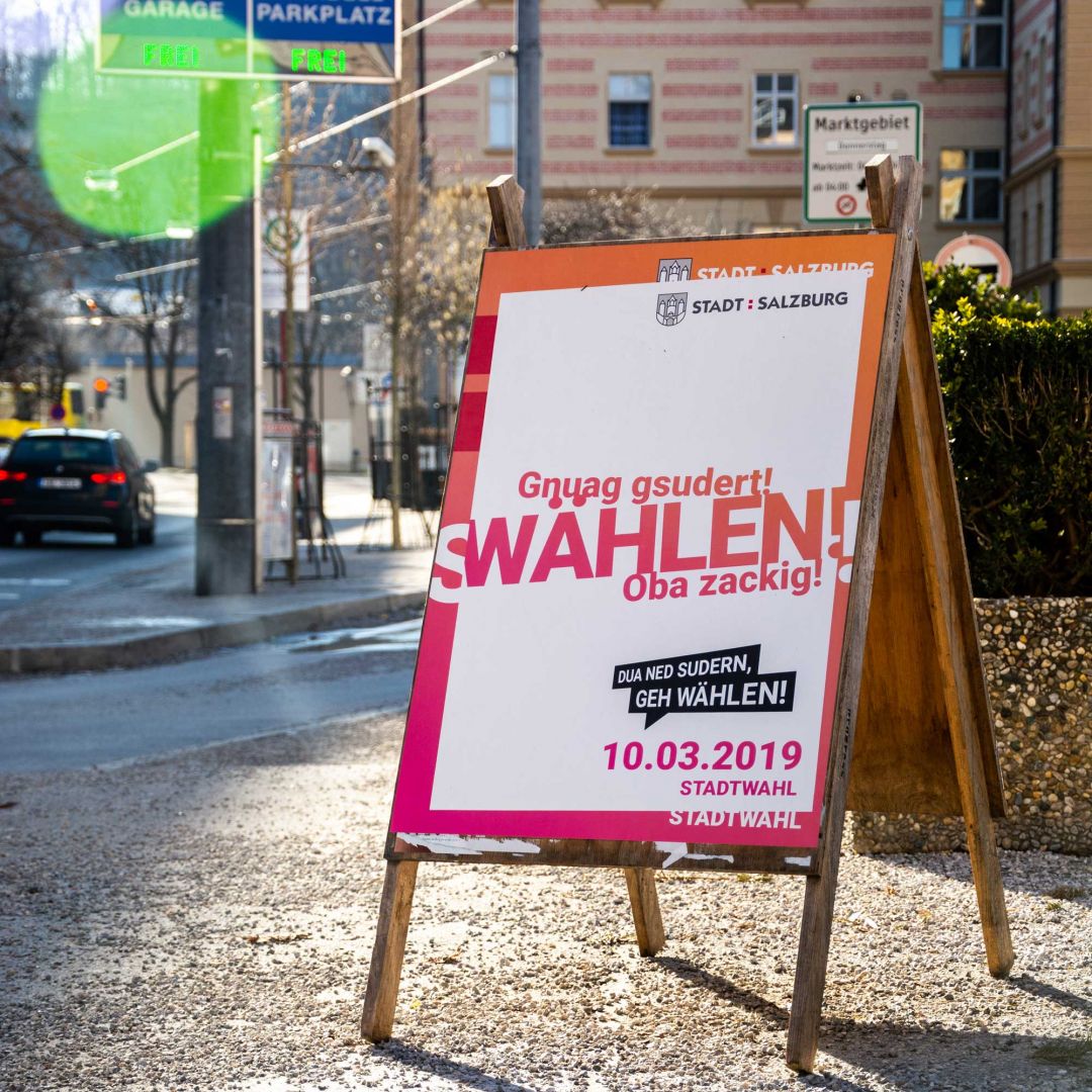 Das Diplomprojektteam Lia-Marie Radauer, Sebastian Panosch und Mira Schwab, arbeitet gemeinsam mit der Stadt Salzburg an einer Jungwähler*innen Mobilisierungsampagne für die Stadtwahl 2019. Die Kampagne ist provokativ und bunt und soll somit mit ihrem Design und den auf Dialekt formulierten Sprüchen vor allem Erstwähler*innen der Stadt überzeugen, wählen zu gehen. Ausgewählte Aussagen wie „Öffis sind so a ABZOCKE“ machen auf die Probleme in der Stadt Salzburg aufmerksam und zeigen auf, welche Veränderungen sich Jugendliche wünschen und die Stadt braucht. In der zweiten Phase der Kampagne wird besonders auf den Wahltag aufmerksam gemacht, z.B. unter dem Motto: „Gnuag gsudert, WÄHLEN! Oba zackig.“ Damit wird gezeigt dass nur das Wählen gehen, nicht aber das Sudern, zu einer Veränderung führt.