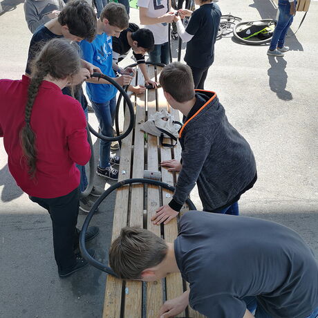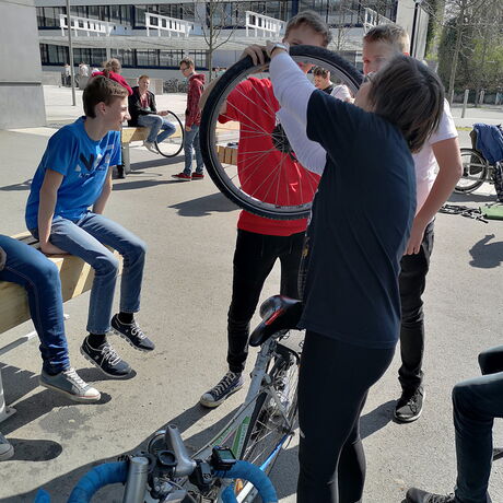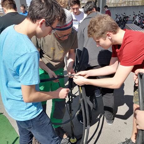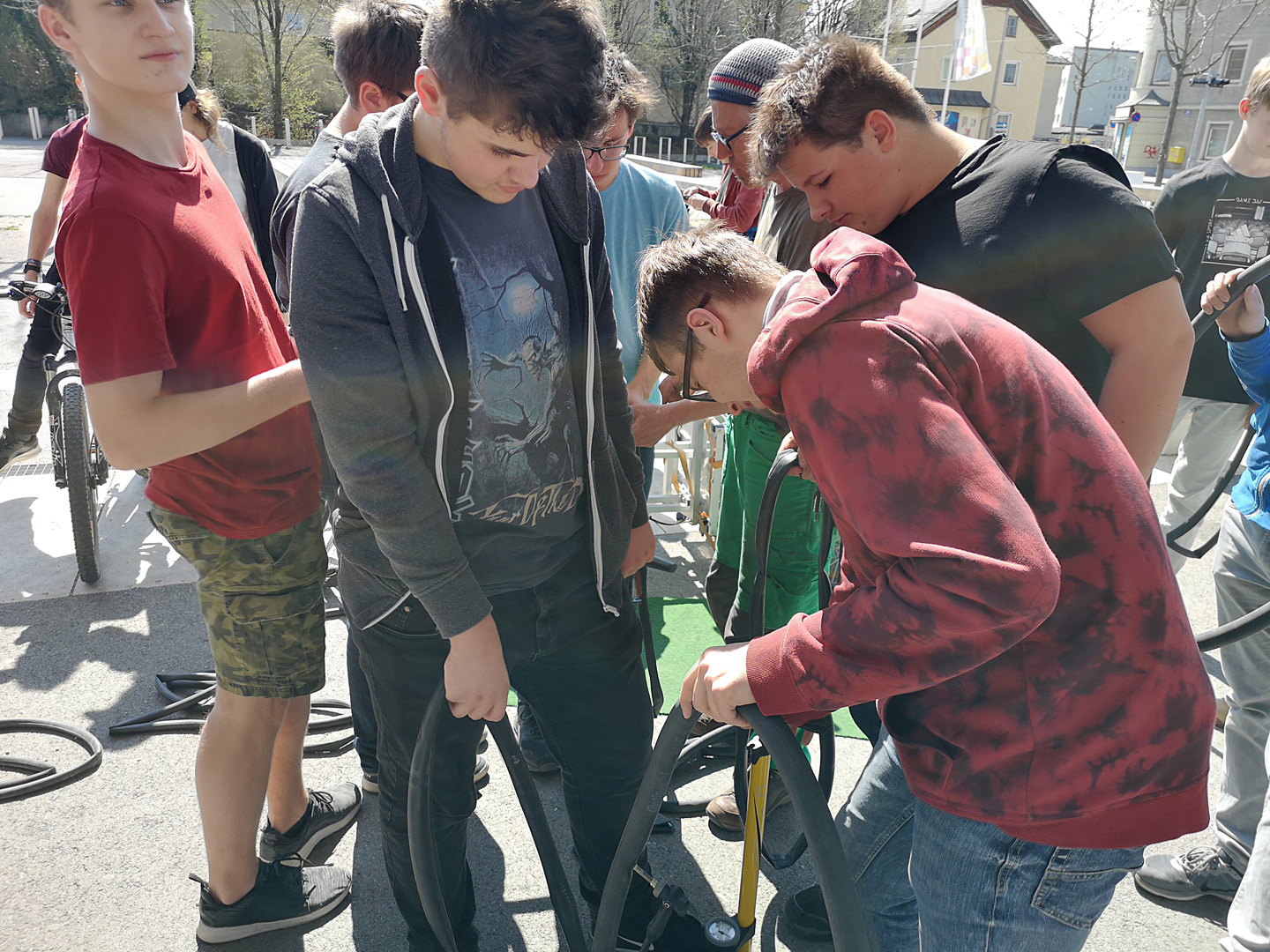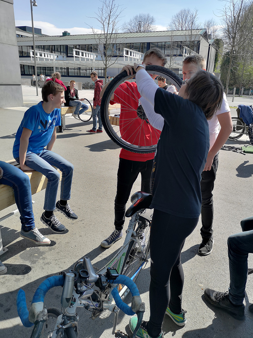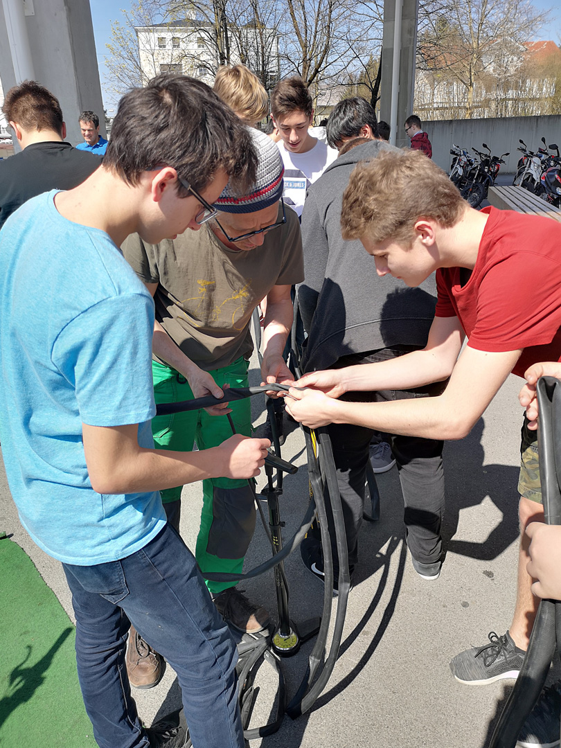 Am Anfang der SOPK-Stunde begaben wir uns gemeinsam mit unserem Klassenvorstand Herrn Dip.-Ing. Offenhuber auf den Vorplatz der HTBLuVA Salzburg, wo Frau Prof. Lindner bereits mit einem sehr netten Herrn auf uns wartete. Anfangs erklärten uns Rio und Frau Prof. Lindner die Grundlagen der Radreparatur, den Aufbau der Fahrradbremsen und verschiedene Arten von Schläuchen und Ventilen. Danach durften wir erstmals selbst ans Werk gehen: Jeder konnte nach Anleitung einen Fahrradmantel mit Hilfe von Reifenhebern von der Felge abziehen, das Loch im Schlauch mit Hilfe von einigen Tricks lokalisieren, danach die zu flickende Stelle mit sehr feinem Schleifpapier ein bisschen anschleifen, Kleber auftragen und den Reifen danach mit einem Gummistück flicken. Daraufhin mussten wir den Schlauch wieder zurück auf die Felge ziehen, den Reifen aufpumpen und mit ausgesprochen großer Erfolgsquote an einem Fahrrad ausprobieren. Nach dieser kurzen Praxiseinheit zeigte uns Rio noch, wie man die Bremsen eines Fahrrades ordnungsgemäß wartet und gegebenenfalls auch diverse Teile auswechselt.