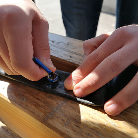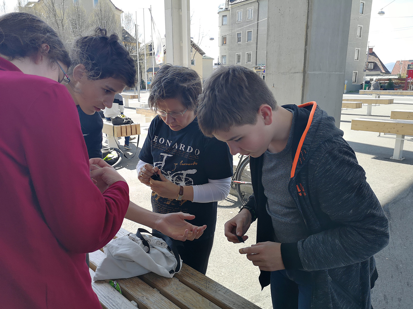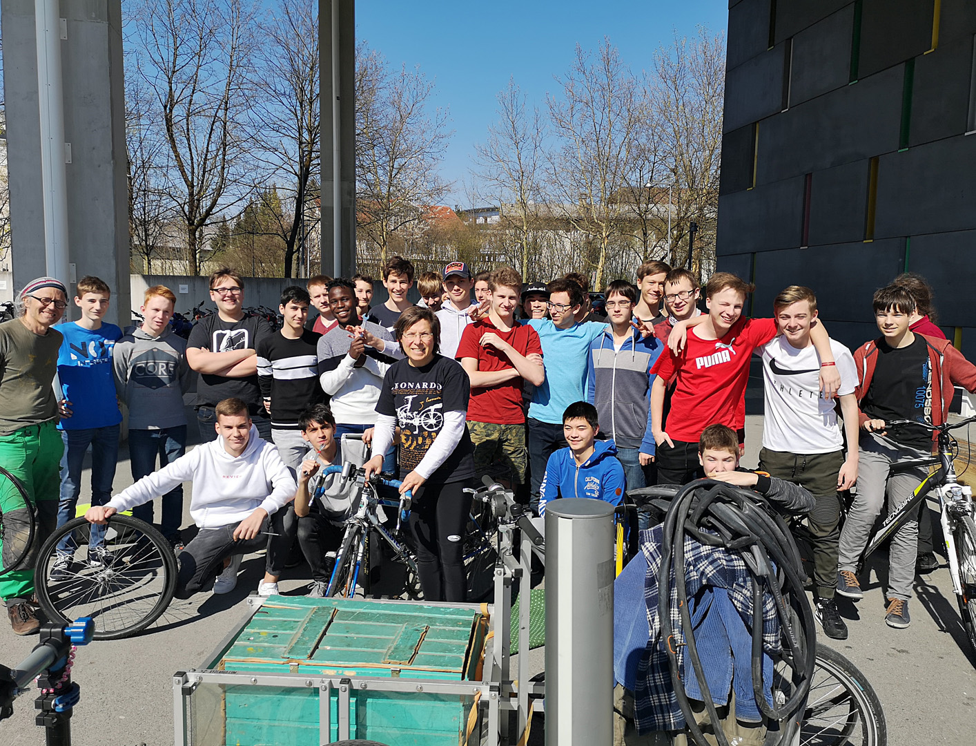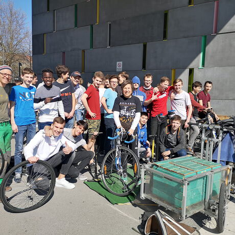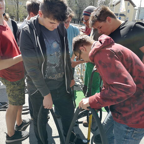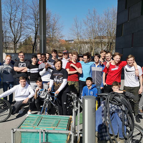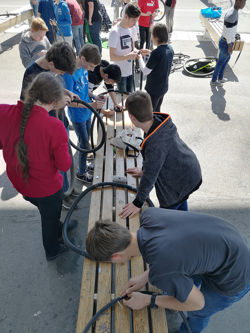 Am Anfang der SOPK-Stunde begaben wir uns gemeinsam mit unserem Klassenvorstand Herrn Dip.-Ing. Offenhuber auf den Vorplatz der HTBLuVA Salzburg, wo Frau Prof. Lindner bereits mit einem sehr netten Herrn auf uns wartete. Anfangs erklärten uns Rio und Frau Prof. Lindner die Grundlagen der Radreparatur, den Aufbau der Fahrradbremsen und verschiedene Arten von Schläuchen und Ventilen. Danach durften wir erstmals selbst ans Werk gehen: Jeder konnte nach Anleitung einen Fahrradmantel mit Hilfe von Reifenhebern von der Felge abziehen, das Loch im Schlauch mit Hilfe von einigen Tricks lokalisieren, danach die zu flickende Stelle mit sehr feinem Schleifpapier ein bisschen anschleifen, Kleber auftragen und den Reifen danach mit einem Gummistück flicken. Daraufhin mussten wir den Schlauch wieder zurück auf die Felge ziehen, den Reifen aufpumpen und mit ausgesprochen großer Erfolgsquote an einem Fahrrad ausprobieren. Nach dieser kurzen Praxiseinheit zeigte uns Rio noch, wie man die Bremsen eines Fahrrades ordnungsgemäß wartet und gegebenenfalls auch diverse Teile auswechselt.