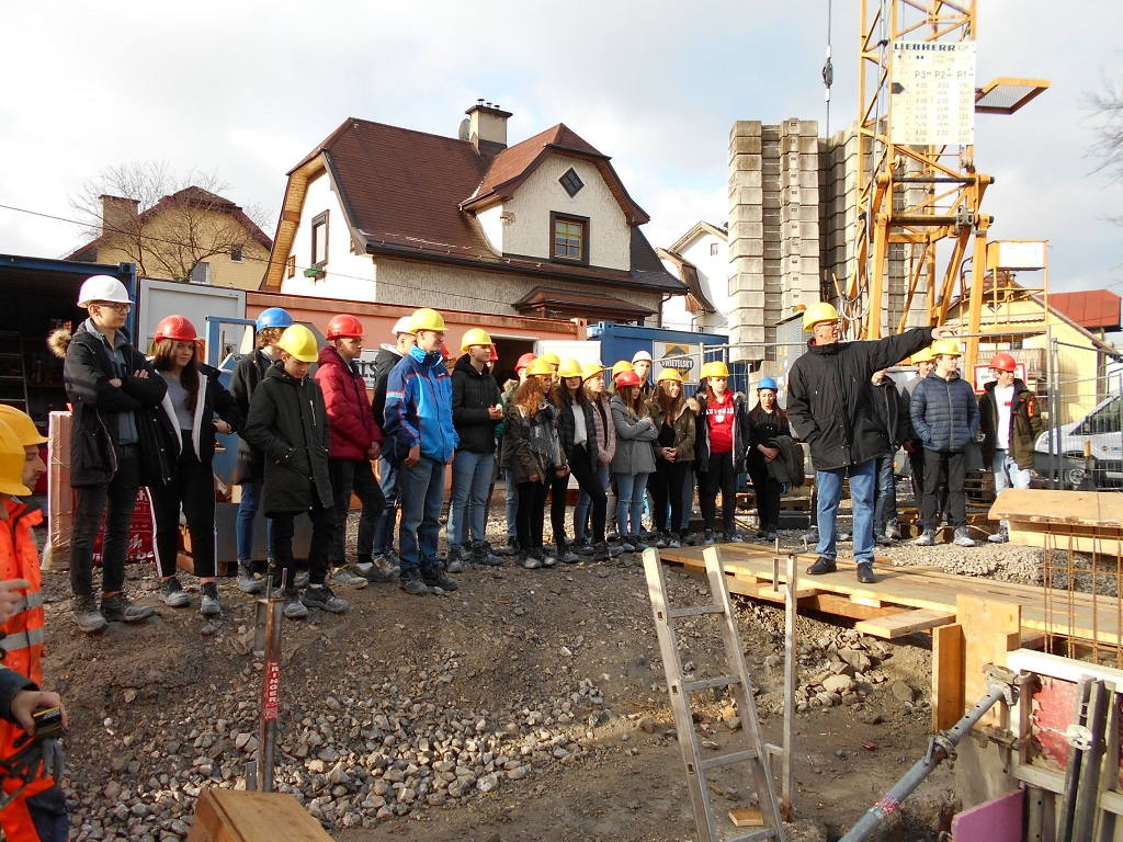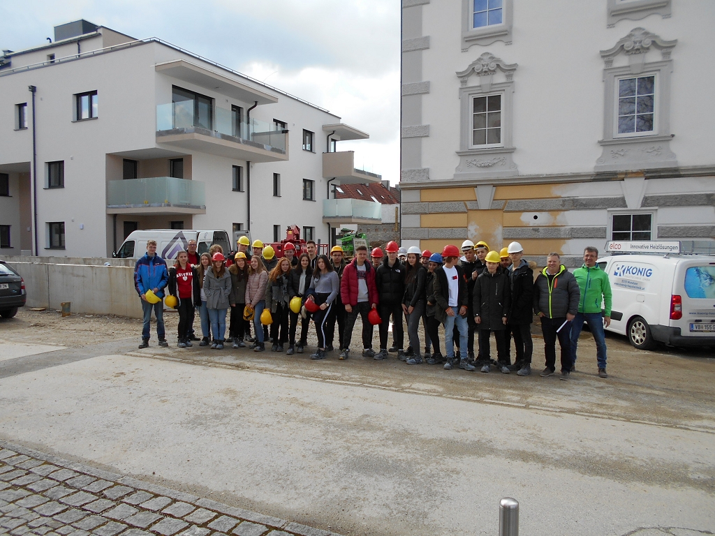 In Begleitung der Lehrkräfte Arch. DI. Josef Brandmüller und Arch. DI. Bernhard Kurzweil besichtigten die Schülerinnen und Schüler der 1CHBTH die Baustellen Wohnhaus Alterbachstraße und Kirchenwirt in Salzburg-Itzling. Die beiden Baustellen boten sich an, da sie in fußläufig erreichbarer Nachbarschaft zur Schule liegen. Die Führung auf der Baustelle Kirchenwirt wurde dankenswerter Weise von Frau Ing. Lodek organisiert und hervorragend von den Herren Mlekusch und Fagerer, alle von der Leitgöb Wohnbau Bauträger GmbH hervorragend abgewickelt.