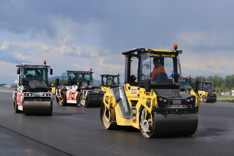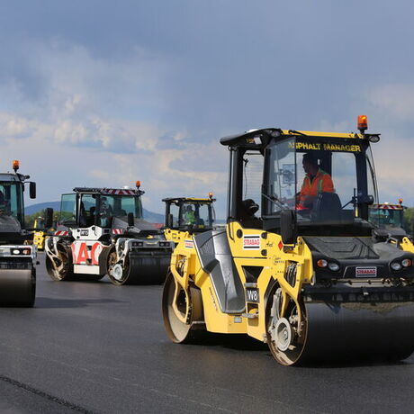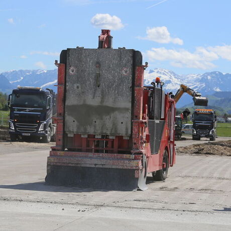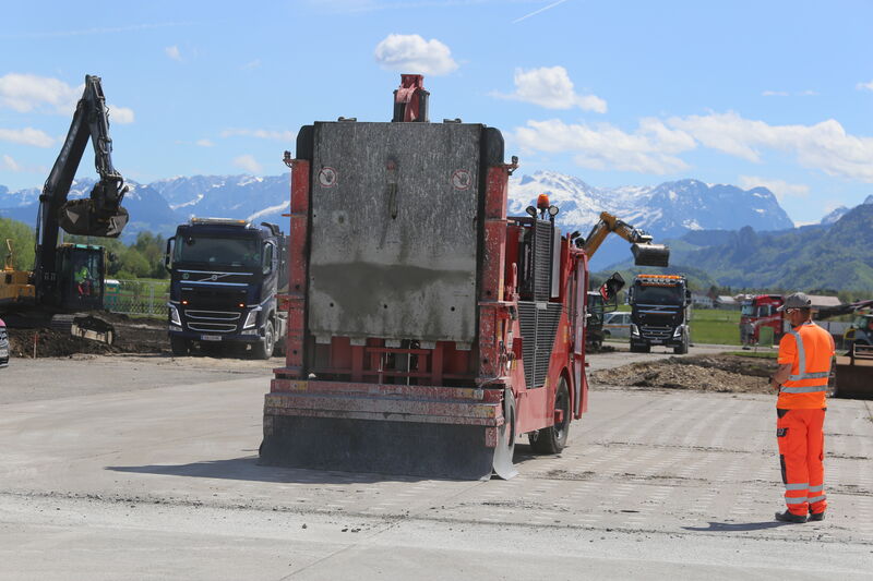 Zudem bekamen wir Einsicht in speziell entwickelte Software, wie zum Beispiel die Walzen-Software: Jede Walze hat einen GPS-Sender und es wird aufgezeichnet, wo bereits verdichtet wurde und wo nicht, sodass jeder Walzenfahrer auf dem Display im Führerhaus sieht, wo er noch fahren muss und wo bereits genügend verdichtet wurde. Dieses Display steht auch im Büro des Projektleiters, der somit von seinem Container aus alles kontrollieren kann.