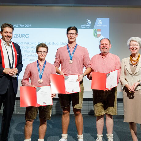 Von links: Harald Mahrer (WKO-Präsident), Jakob Buchsteiner, David Viskovic, Hermann Studnitzka (Mechatronik-Experte), Elisabeth Udolf-Strobl (Bundesministerin für Digitalisierung und Wirtschaftsstandort).
