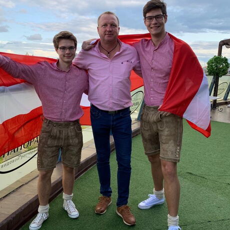 - Jakob und David mit ihrem Lehrer Gerhard Egger am Dach des Kazan Exhibition Centers