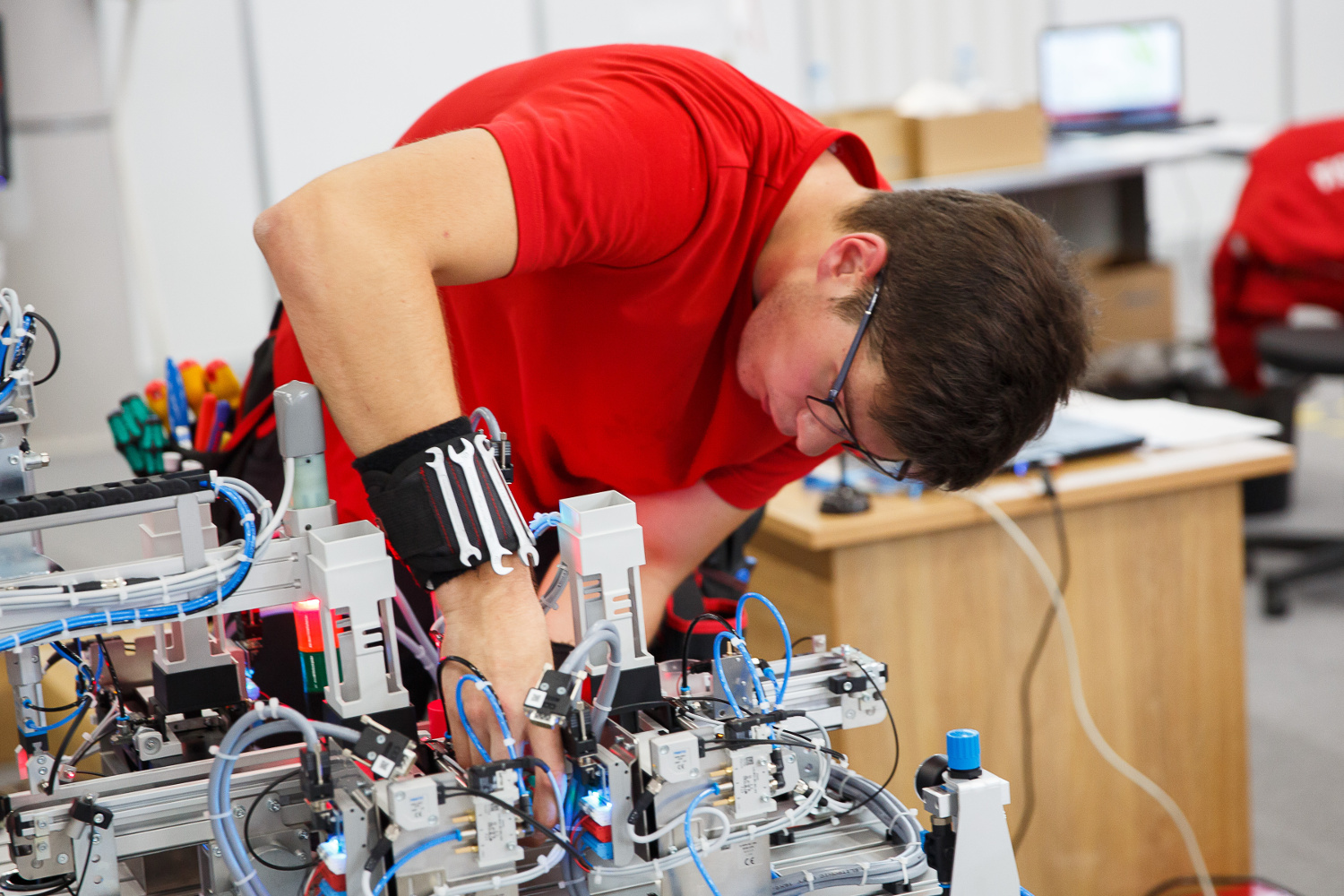 Beim Mechatronik-Wettbewerb wurde innerhalb von 17 Stunden ein voll automatisiertes Modell einer industriellen Fertigungsanlage aufgebaut. Die Teilnehmer mussten die Anlage mechanisch aufbauen, die elektrischen und pneumatischen Leitungen verlegen und das System anschließend programmieren. Die größten Schwierigkeiten des Wettbewerbs sind der enorme Zeitdruck und das geforderte hohe Maß an professioneller und sauberer Ausführung der Arbeit.
