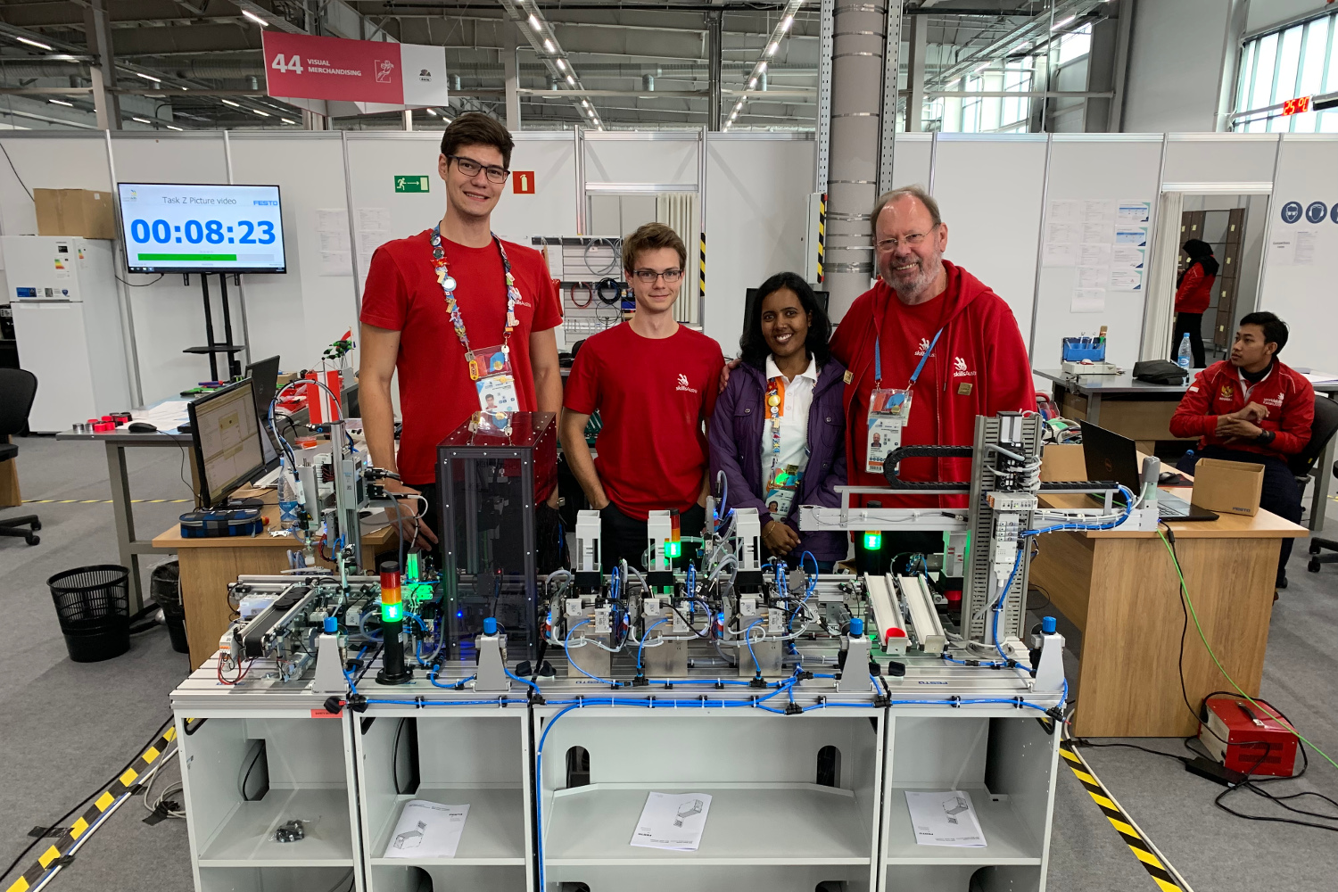 - Die fertige Anlage nach der Bewertung. Mit im Bild eine Jurorin aus Indien und der österreichische Mechatronik-Experte Hermann Studnitzka