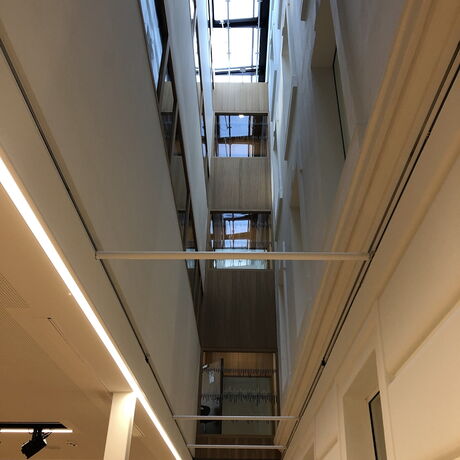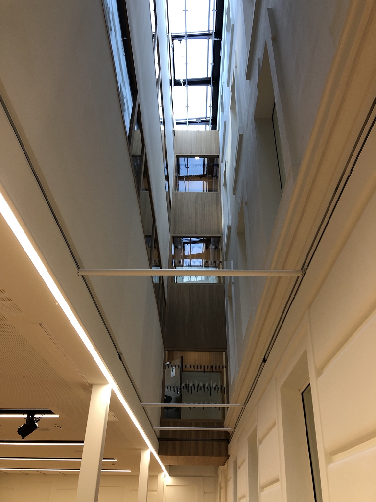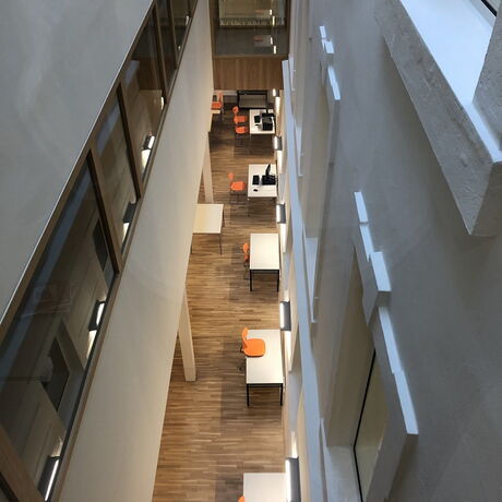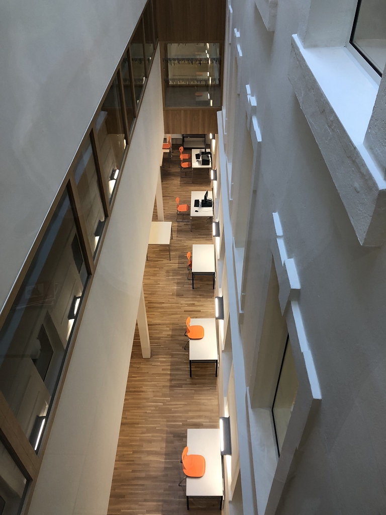 In einer schönen Symbiose fügt sich die Erweiterung in den Bestand, einen ehemaligen Kasernenbau aus dem 19. Jahrhundert, ein. Diese Zäsur zwischen „Alt“ und „Neu“ wird betont durch die Erhaltung der alten Fassadenstruktur und die bewusste gestalterische Einbindung dieses Bauteils in den neu geschaffenen Innenraum. Zusätzlich lässt sich durch einen gebäudehohen Luftraum dieses Gestaltungselement verstärkt und beabsichtigt erleben.