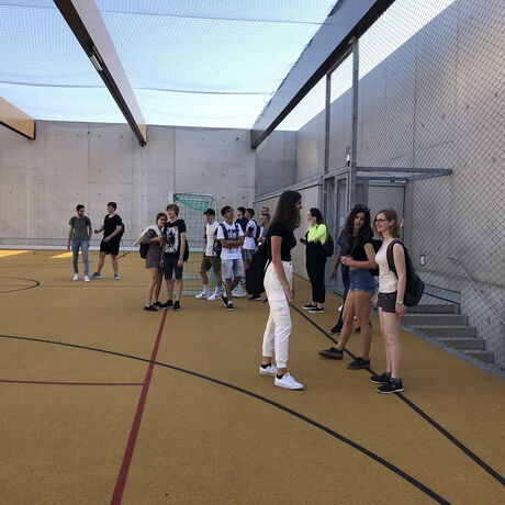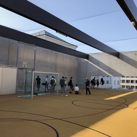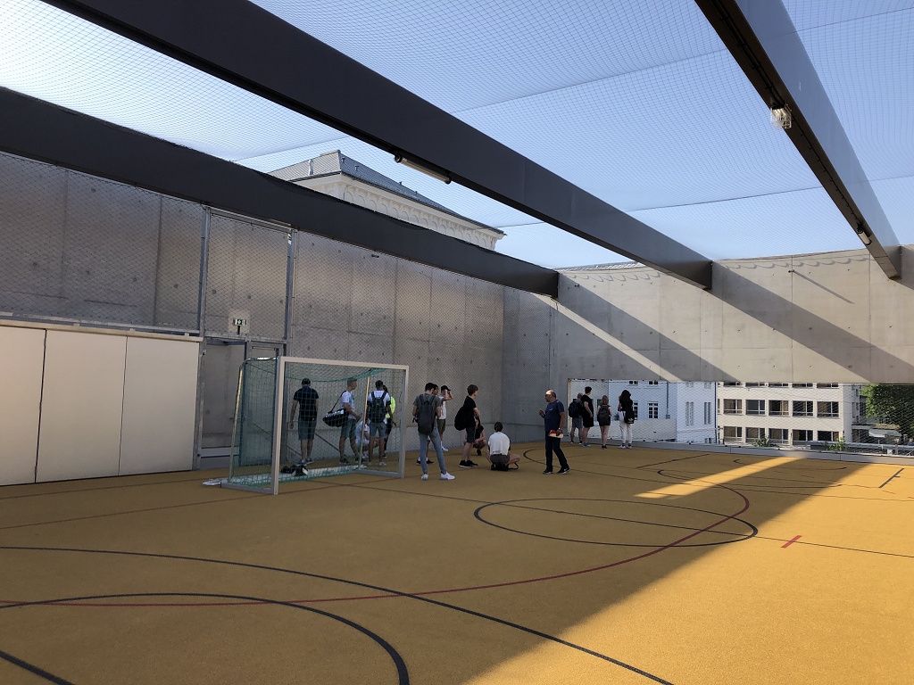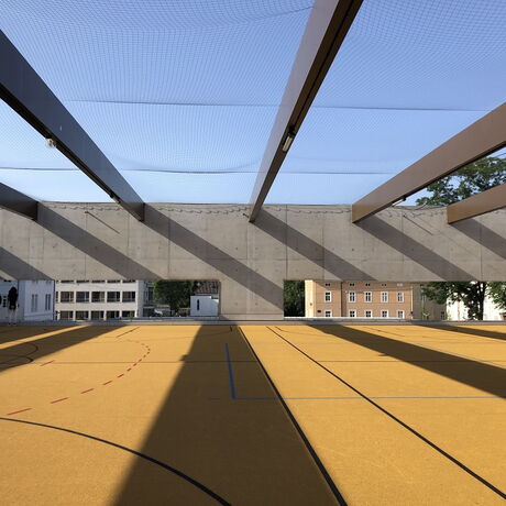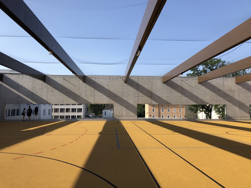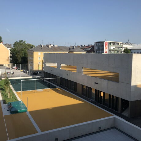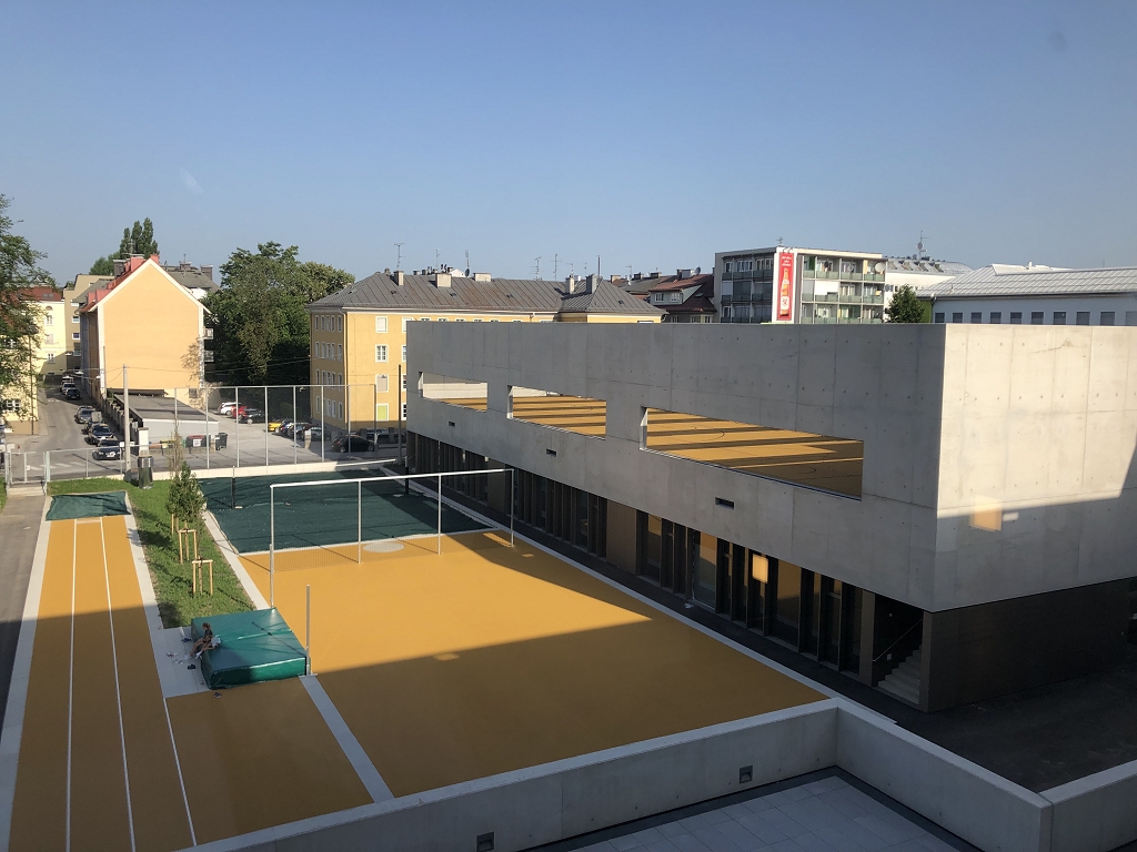 Anstelle der alten Turnhalle wurde ein Erweiterungsbau entlang der stark befahrenen Ignaz-Harrer-Straße errichtet, eine attraktive Turnhalle mit einem Hartplatz auf dem Dach der Halle, die eine interessante Optimierung der Freifläche darstellt und mit Freude genutzt werden wird.