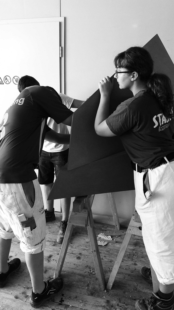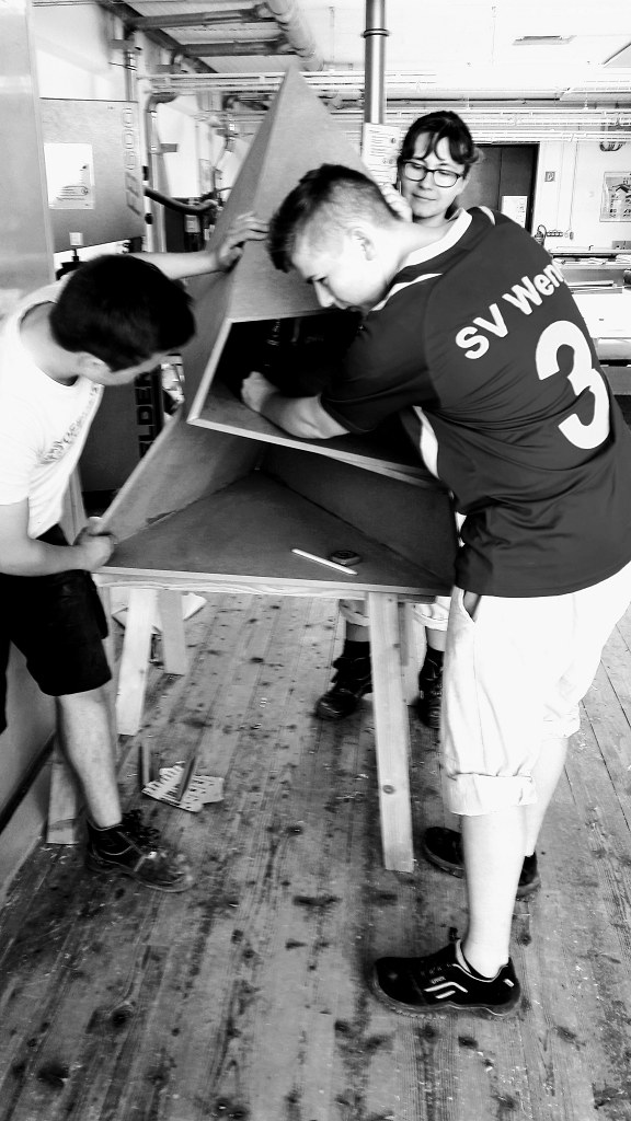 In der 2AHBTH haben wir uns diesem Thema von der Seite der Darstellenden Geometrie genähert. Körperverschneidungen mit Ebenen und die Ermittlung der wahren Größen der Abwicklungen gehören wohl zu den beliebtesten, weil schwierigsten Themenbereichen des DG-Unterrichts. Herausgekommen ist zunächst eine "Dame in Papier", welche hernach von Christine Auer, Michael Helmberger, Alexander Höfer, Johannes Ramsbacher und Tobias Schmied mit der tatkräftigen technologischen Unterstützung von Herrn FL Ing. Hans Georg Laimer BEd in eine zweieinhalb Meter hohe Holzskulptur umgesetzt wurde, die im 1. Stock des Lichthofes 1 ausgestellt ist.