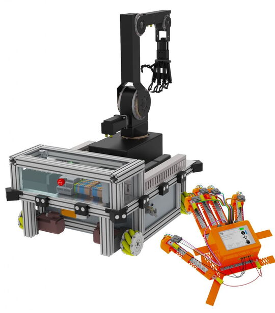 Das mobile Robotersystem mit Greifer wird für Vorführzwecke eingesetzt. Die Steuerung des Systems wurde mit einem Fernsteuergerät in Form eines Handschuhs realisiert, der auf Gesten reagiert. Der flexible, akkubetriebene Handschuh wurde mithilfe des 3D-Druck-Verfahrens hergestellt. In einem mechanischen Gerüst befinden sich das Robotersystem und alle weiteren Komponenten.