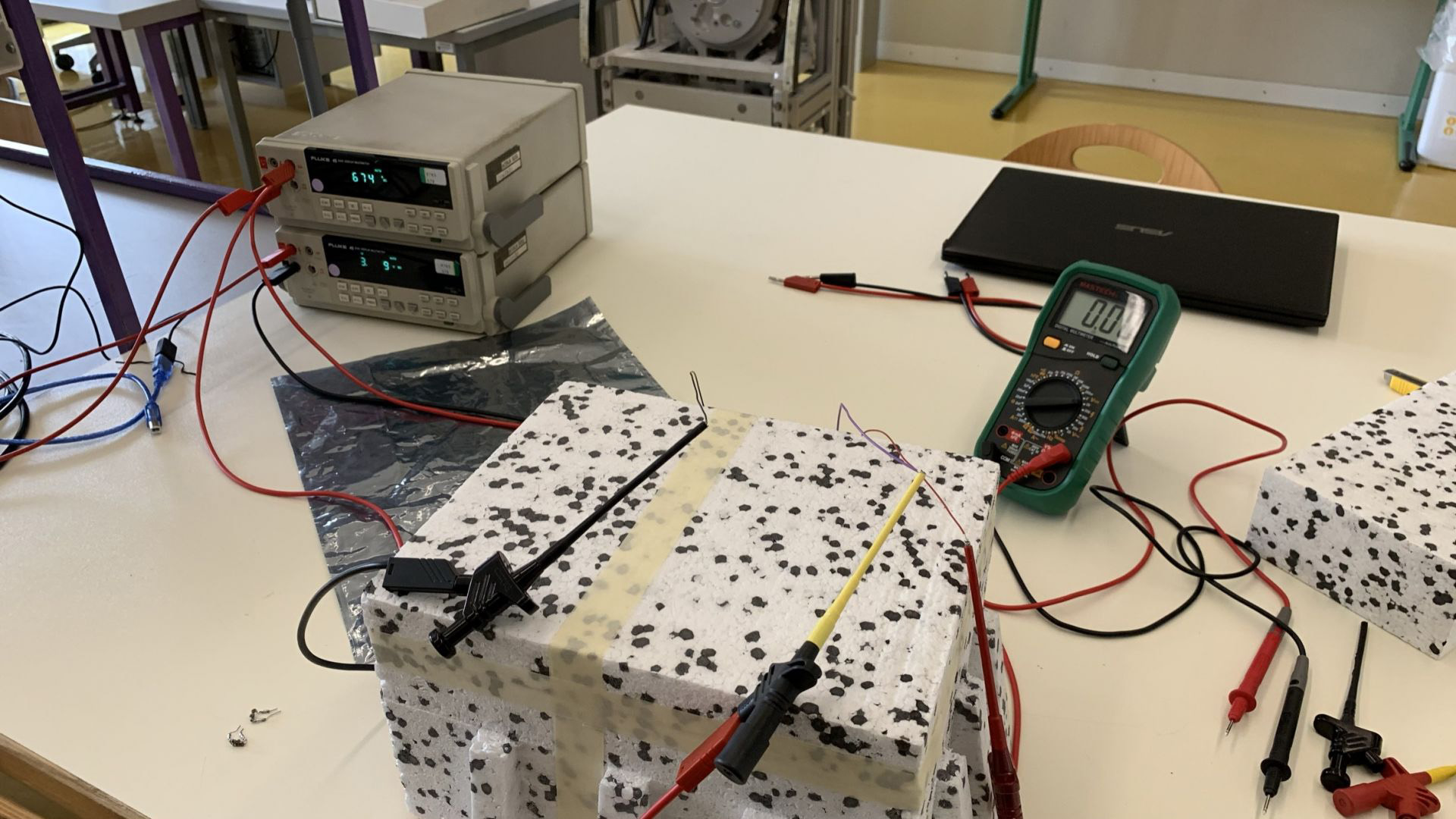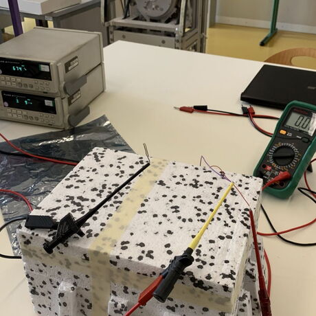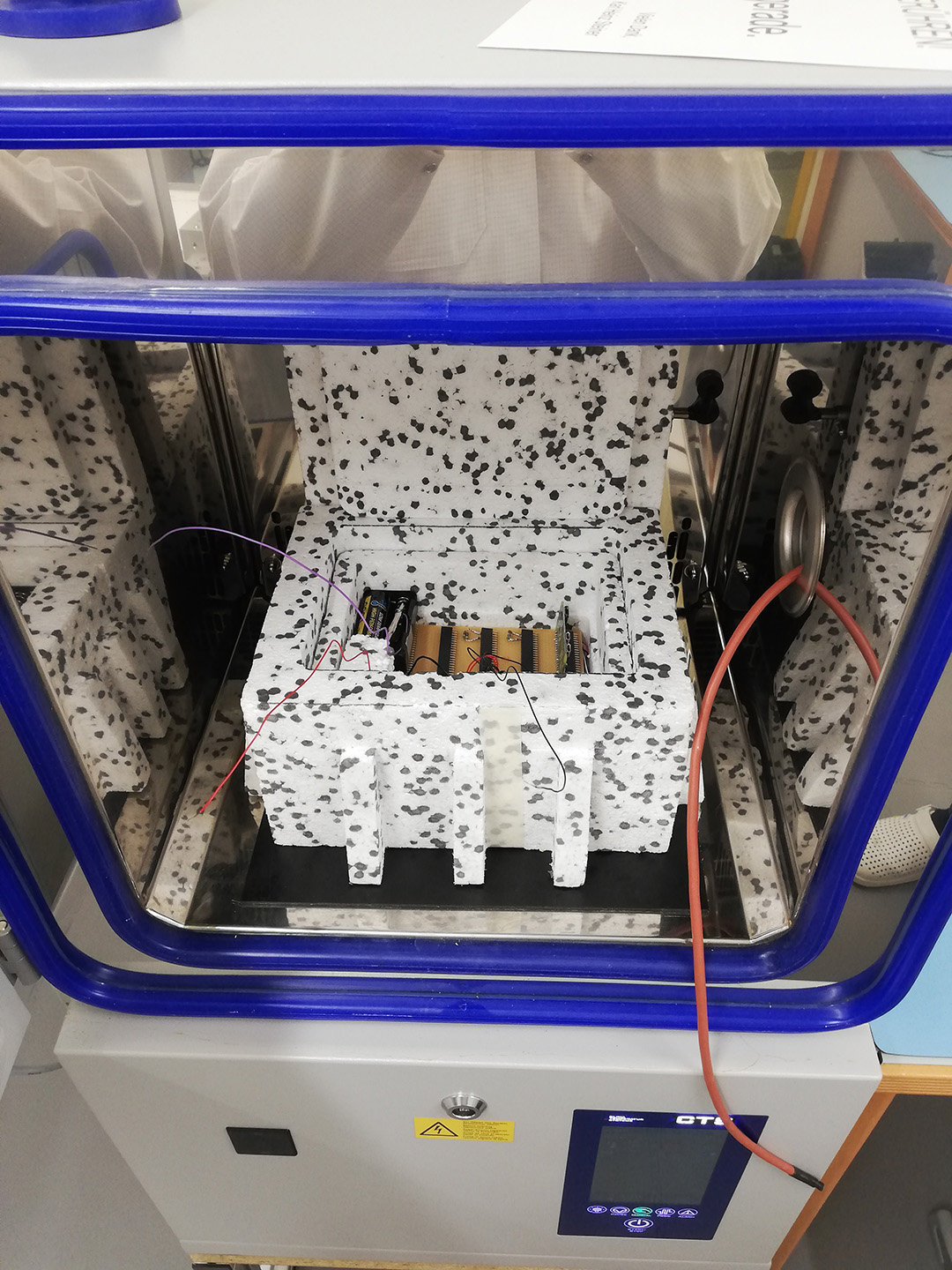 Die Bilder zeigen Testvorbereitungen der ersten Temperaturtests von „Paula“ bei Raumtemperatur und im Temperaturprüfstand. Die Elektronik ist zu diesem Zeitpunkt nicht fertig. Daher sind fehlende Komponenten durch Heizwiderstände ersetzt.