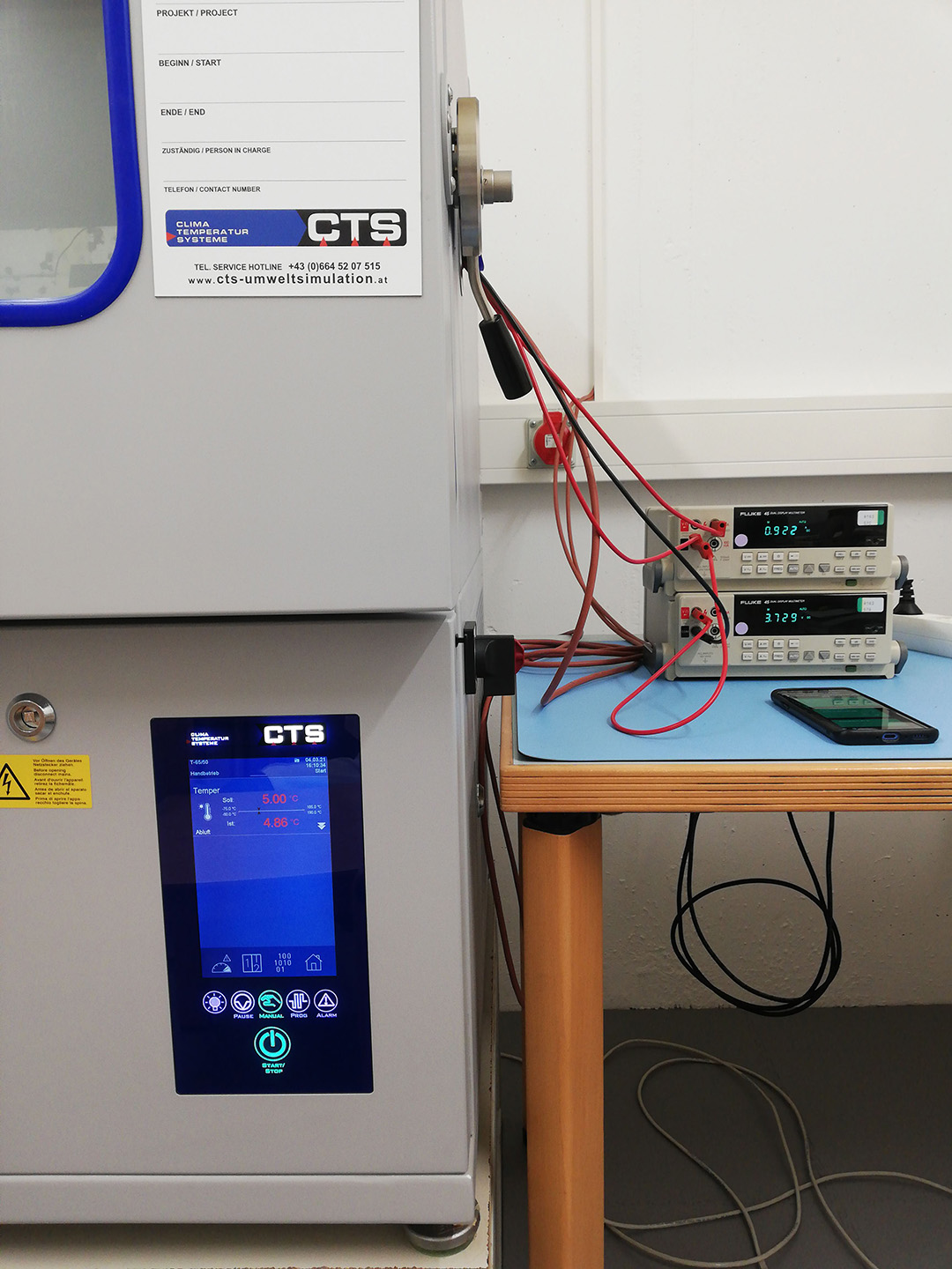 Auf folgenden Bildern sind die ersten Temperaturtests zu sehen. Es wird mit einem Temperaturprüfschrank die Außentemperatur gesenkt und die Temperaturänderung im Inneren der Sonde aufgezeichnet.