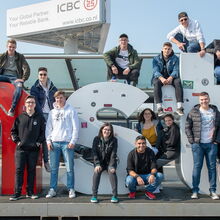 Maximilian Sams, Alexander Kranzinger und Sabrina Reiter führten gemeinsam mit ihrem Projektbetreuer DI Richard Grutschnig ein vertikalverteilendes Förderband vor. Die Bosch-Delegation war begeistert: Angelika Kiessling, Leiterin Unternehmenskommunikation Bosch Österreich (3 v. l.), Peter Wörz, Techn. Leiter Bosch-Werk Hallein (3. V. r.) und Sabine Landstorfer, Personalreferentin Bosch Hallein (2. v. r). Foto: BOSCH